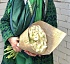 Монобукет из 31 белого ранункулуса в крафтовой бумаге с атласными лентами и лентами из органзы