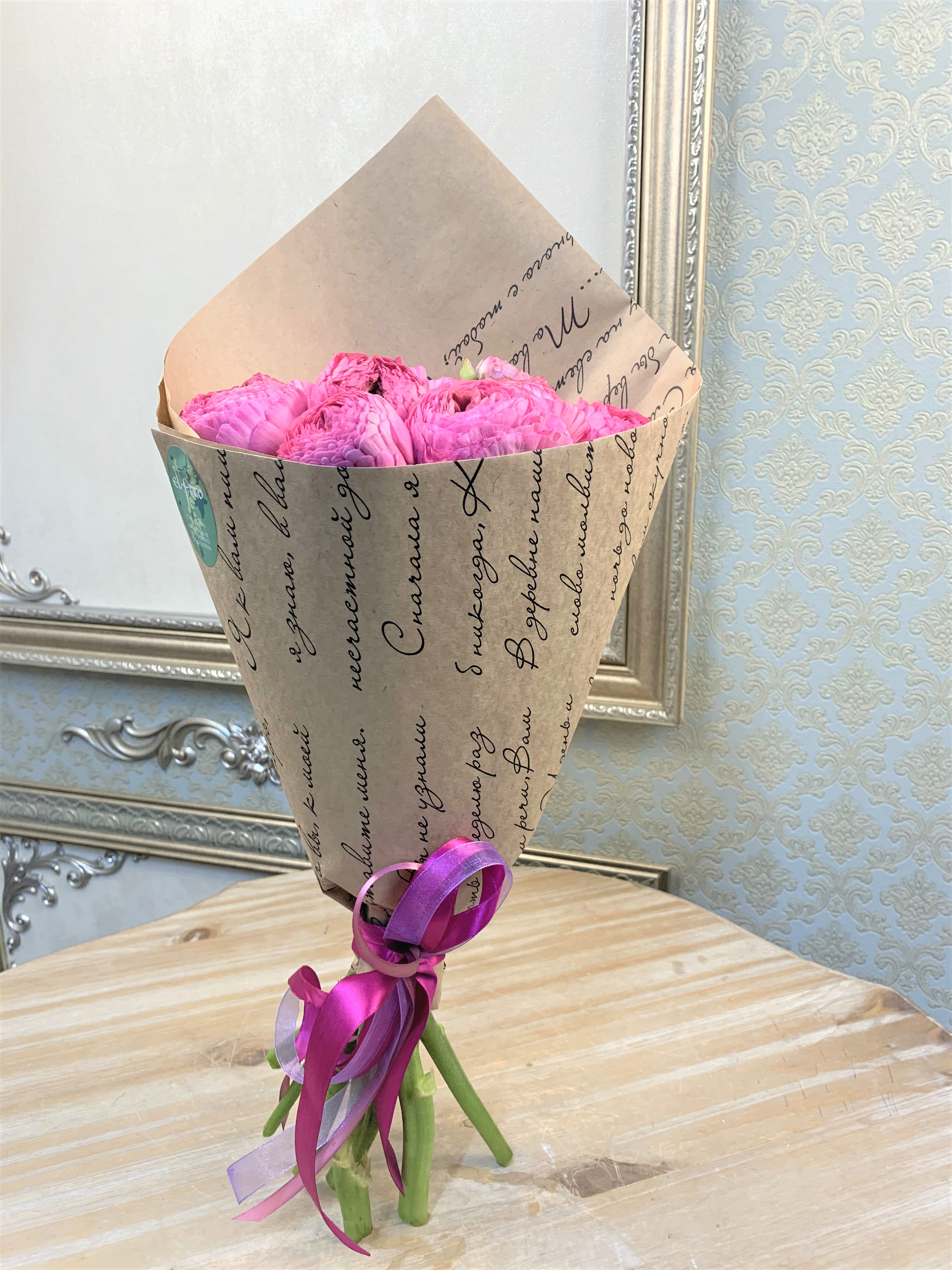 Монобукет из 9 розовых ранункулусов в крафтовой бумаге с атласными лентами и лентами из органзы