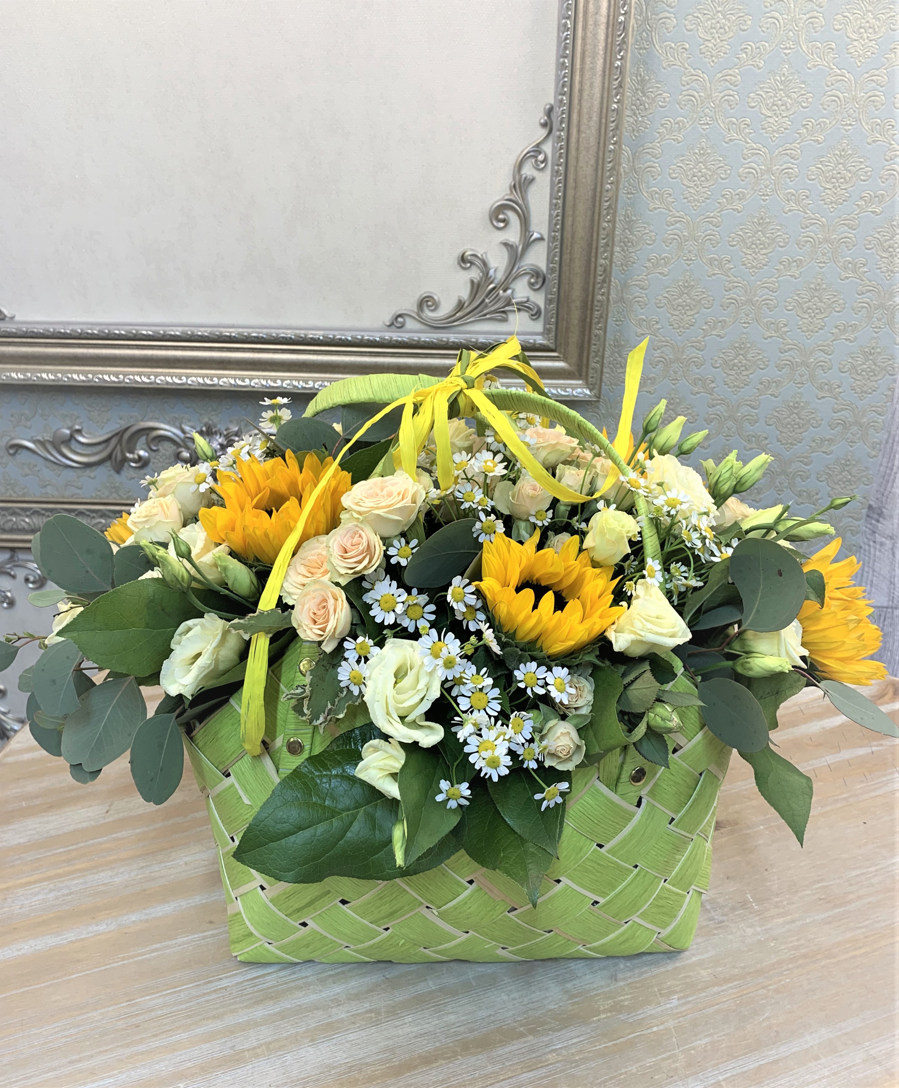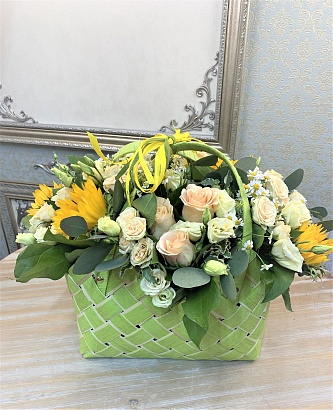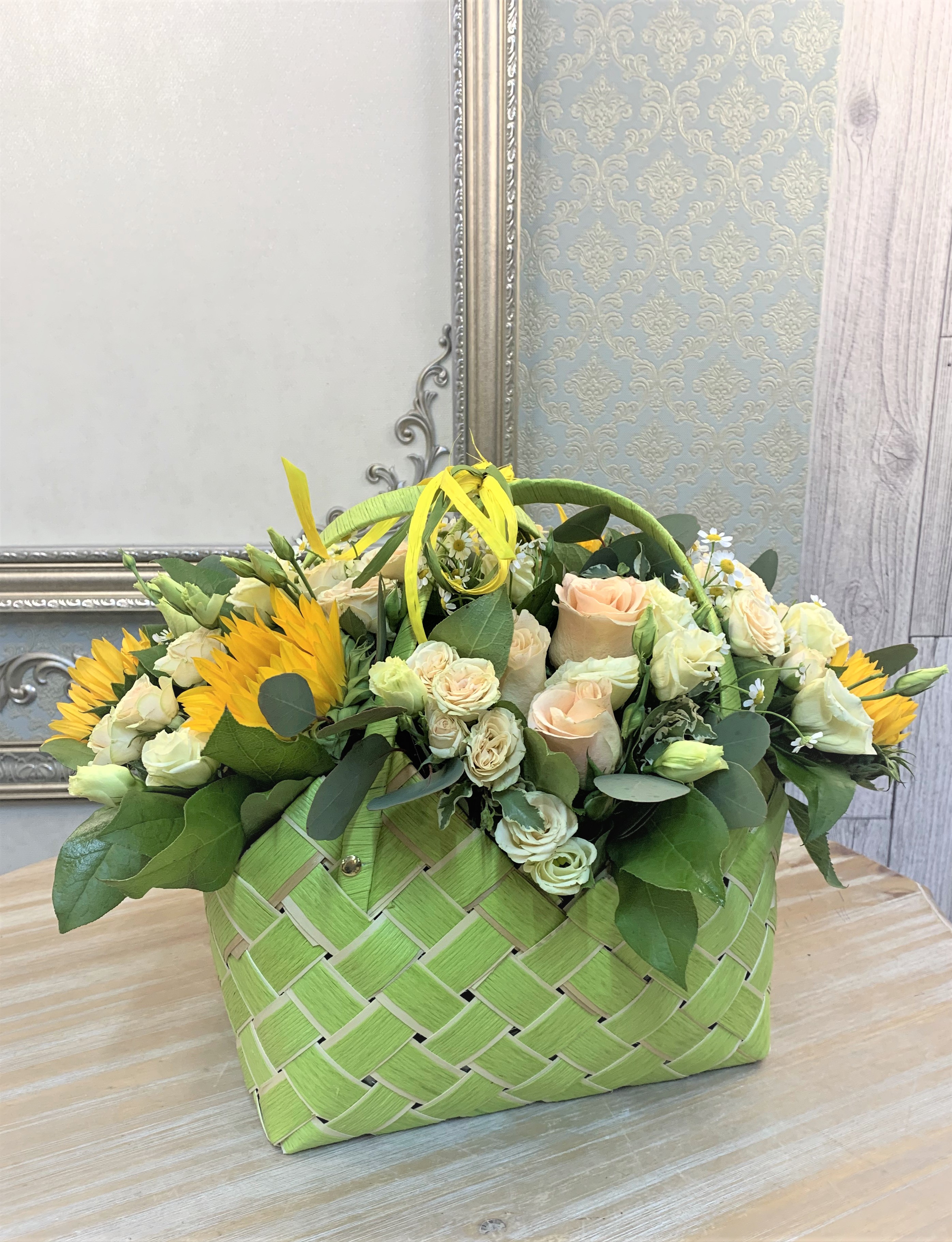 Цветочная композиция в салатной плетеной декоративной сумочке с лизиантусом (эустомой), матрикарией, подсолнухами, розами, розами кустовыми, эвкалиптом, салалом