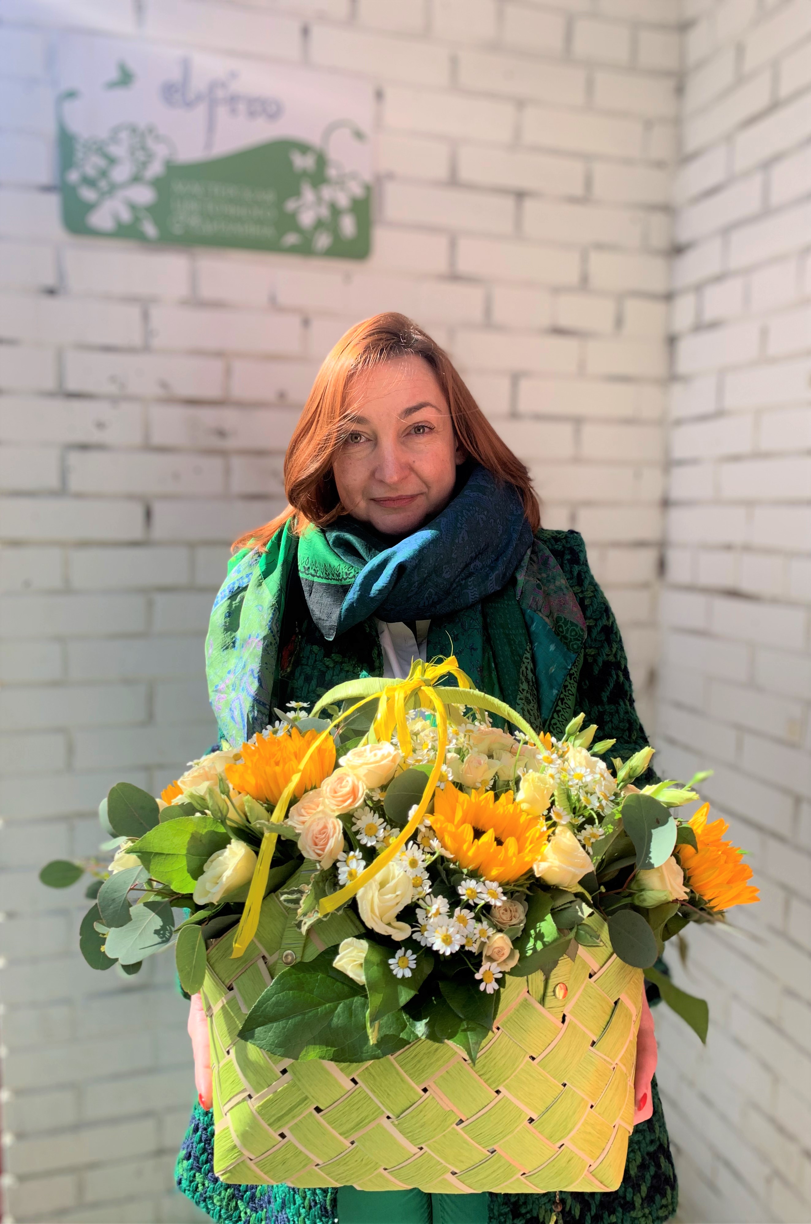 с розами/с матрикарией/с розой кустовой/с салалом/с эвкалиптом/с лизиантусами/с подсолнухами
