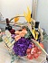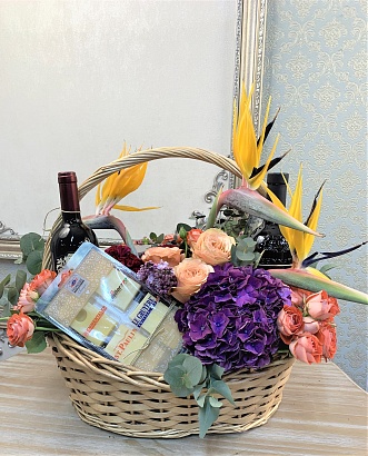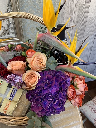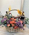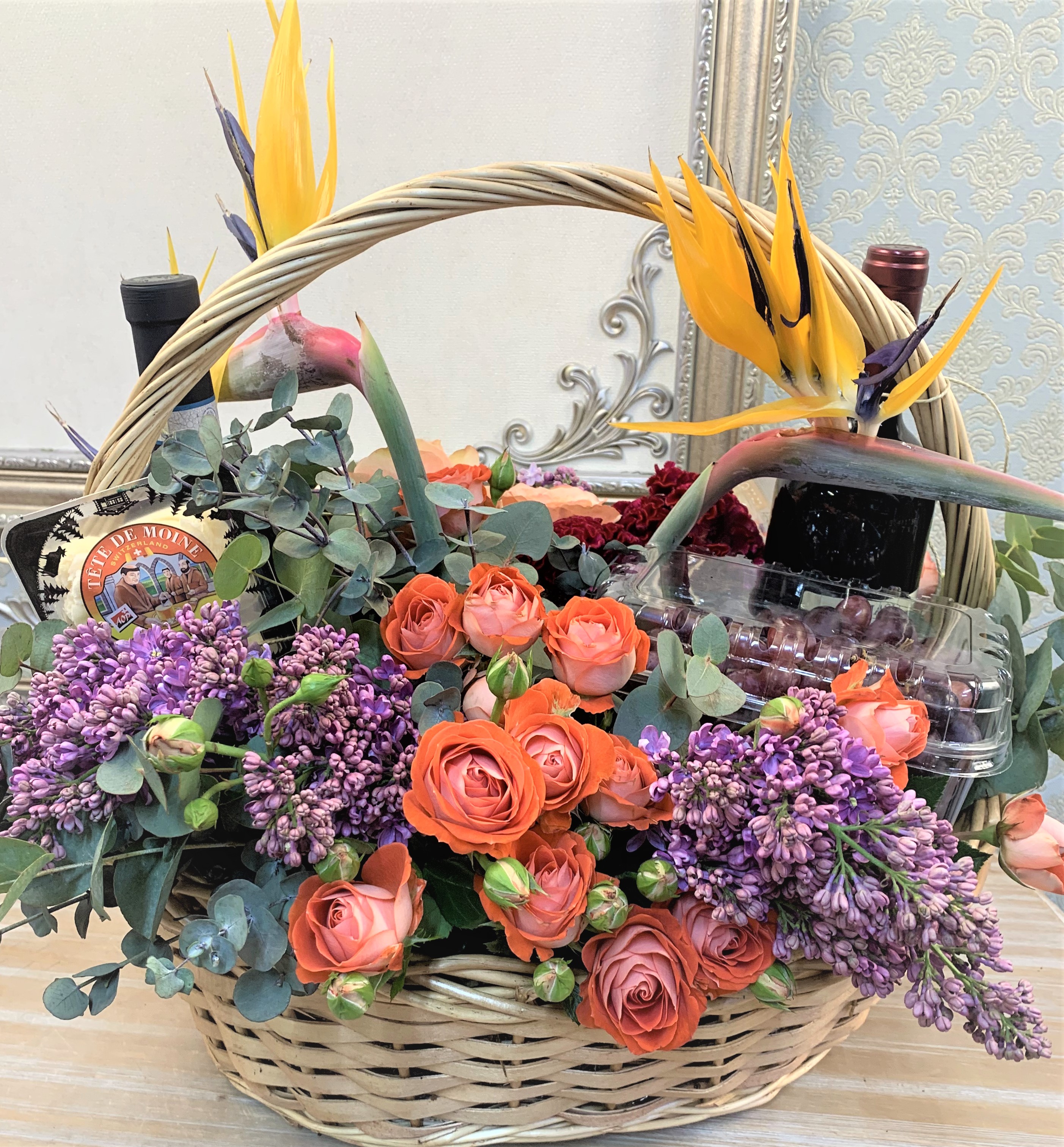 Композиция в плетеной корзине с розой кустовой, розой пионовидной, сиренью, стрелицей, эвкалиптом