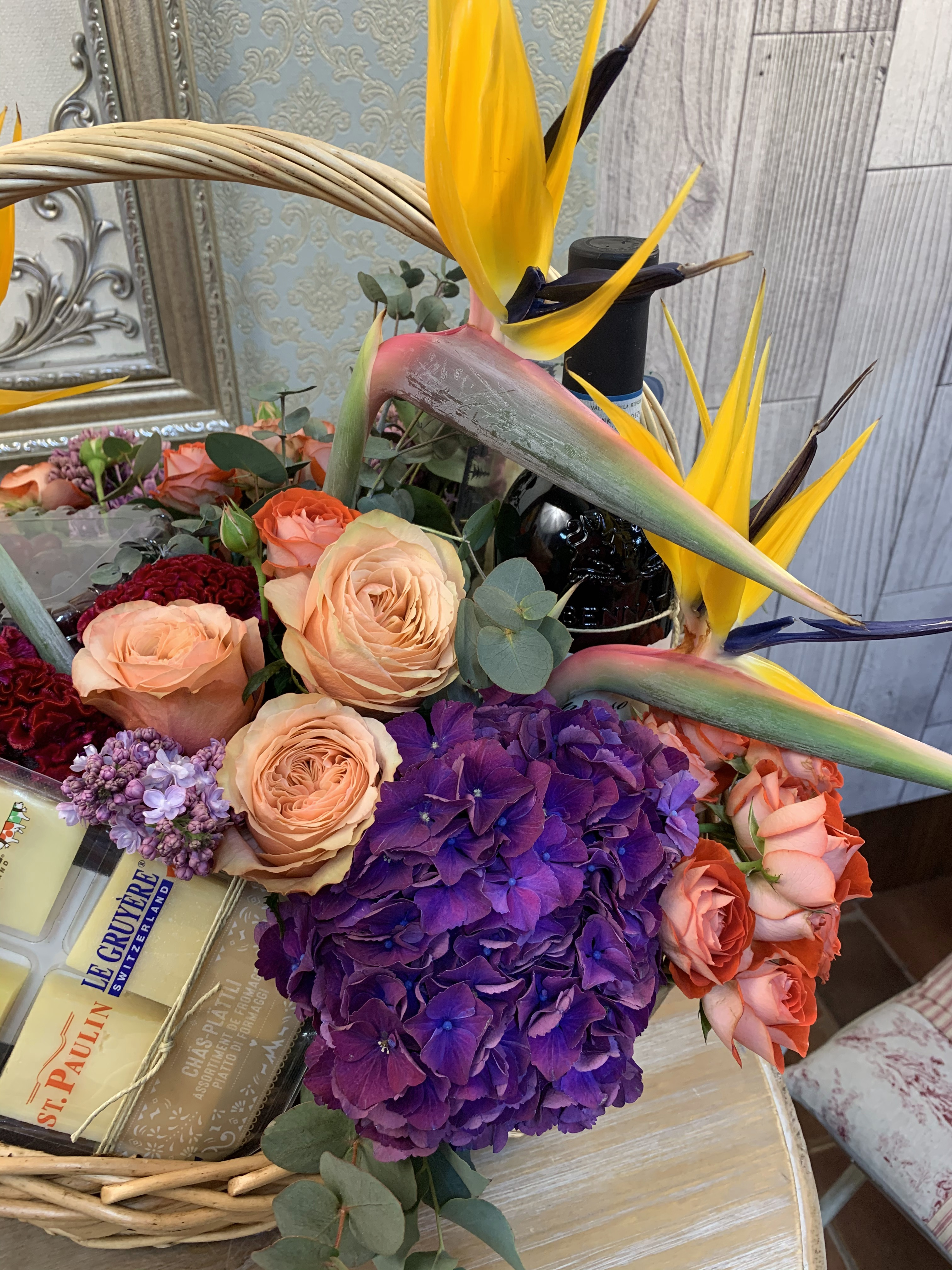с гортензией/с розой кустовой/с розой одноголовой пионовидной/с сиренью/с стрелицией/с эвкалиптом