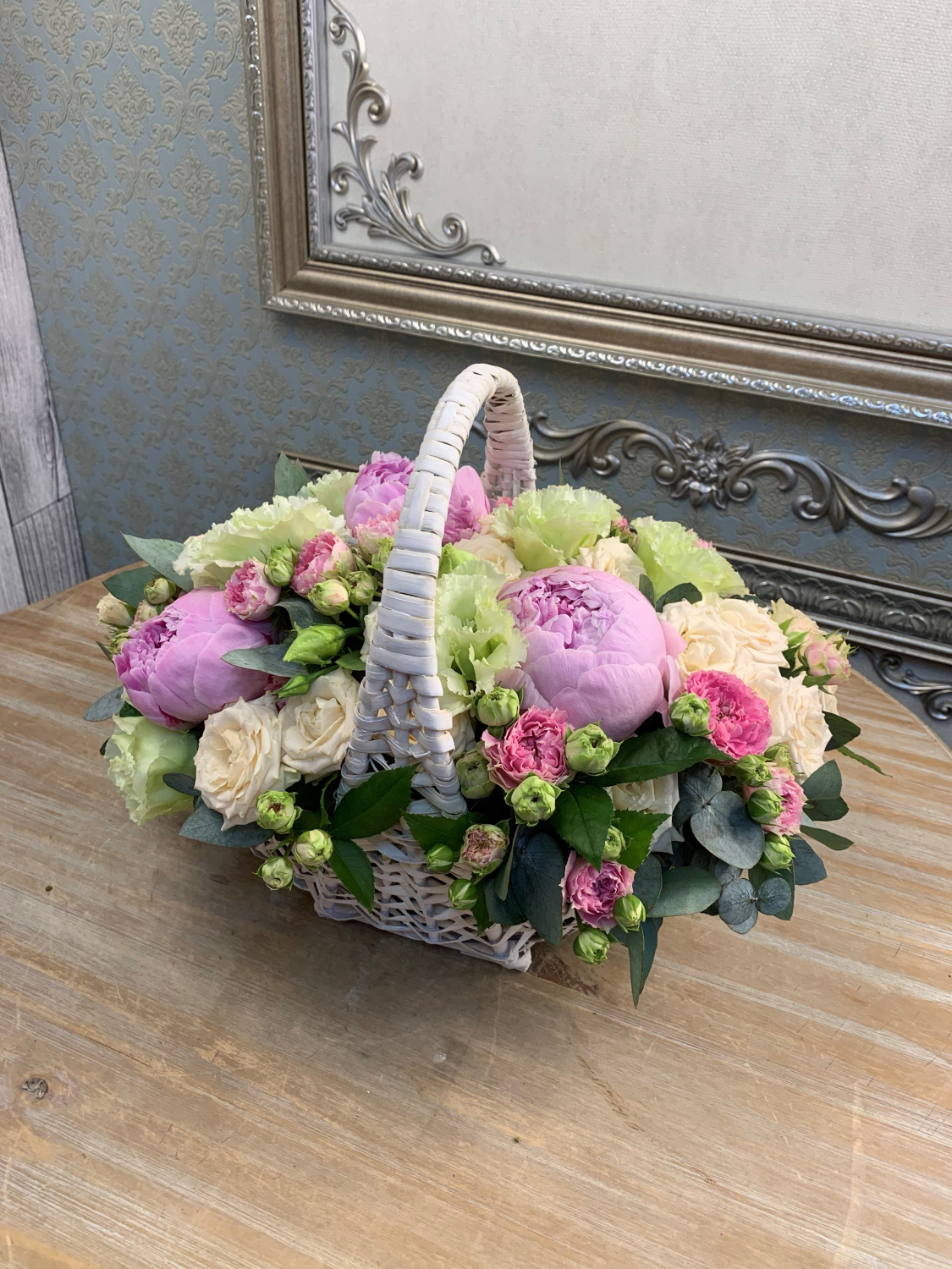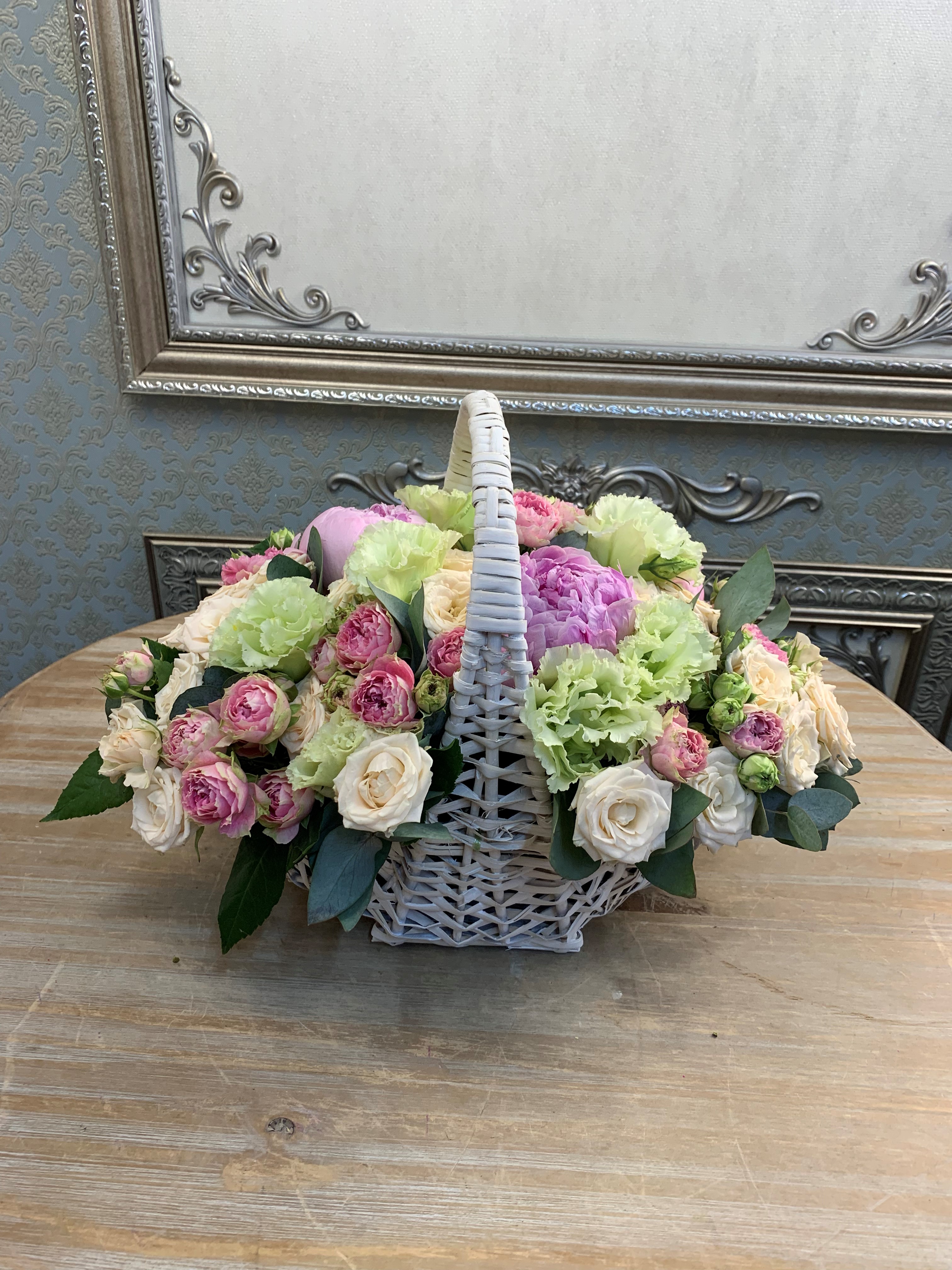 Цветочная композиция в белой плетеной корзине. Состав: пион Сара Бернар, роза кустовая, роза кустовая пионовидная, лизиантус, эвкалипт