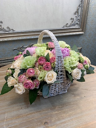 Цветочная композиция в белой плетеной корзине. Состав: пион Сара Бернар, роза кустовая, роза кустова...