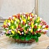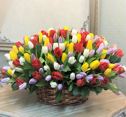 Тюльпан сортовой - 151 шт. в корзине с салалом. Сопутствующие материалы: Корзина плетеная из лозы, О...