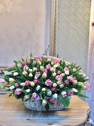 Тюльпан сортовой пионовидный (151 шт.) микс в корзине с салалом. Сопутствующие материалы: Корзина плетеная из лозы тонированная беленая, Оазис (губка для сохранения цветов)