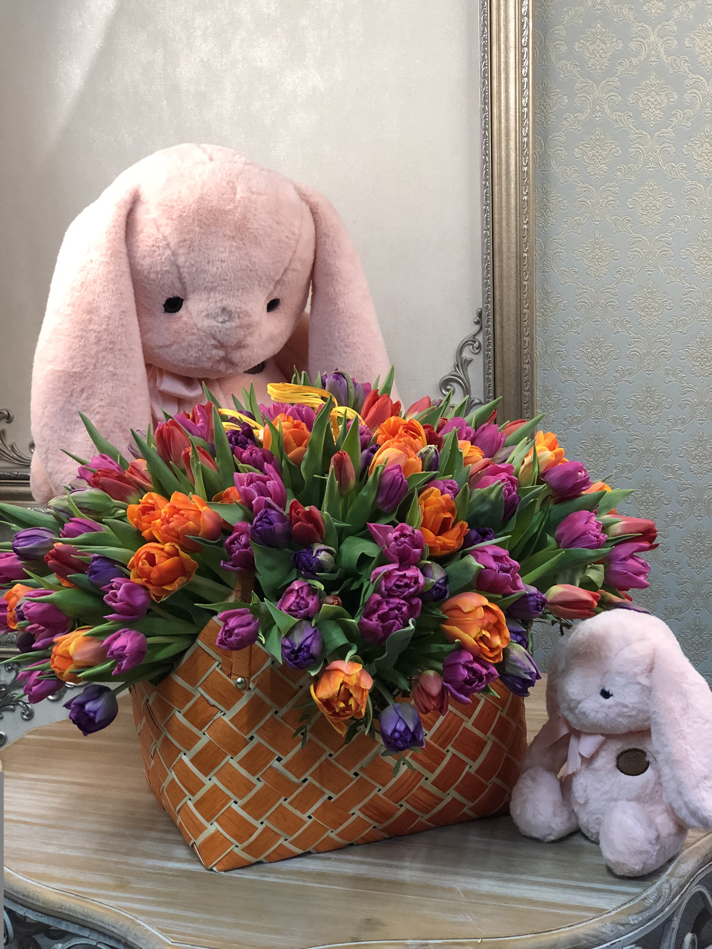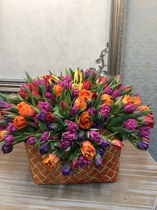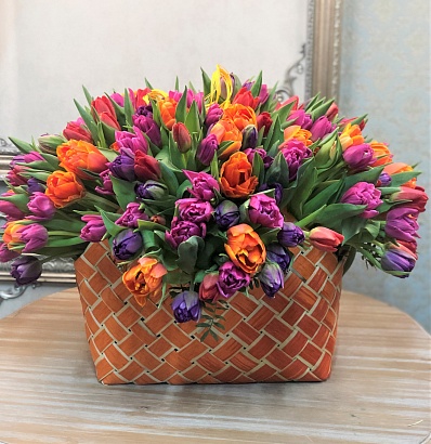 Корзина с 201 пионовидным тюльпаном сортовым. Сопутствующие материалы: Сумочка плетеная тонированная...