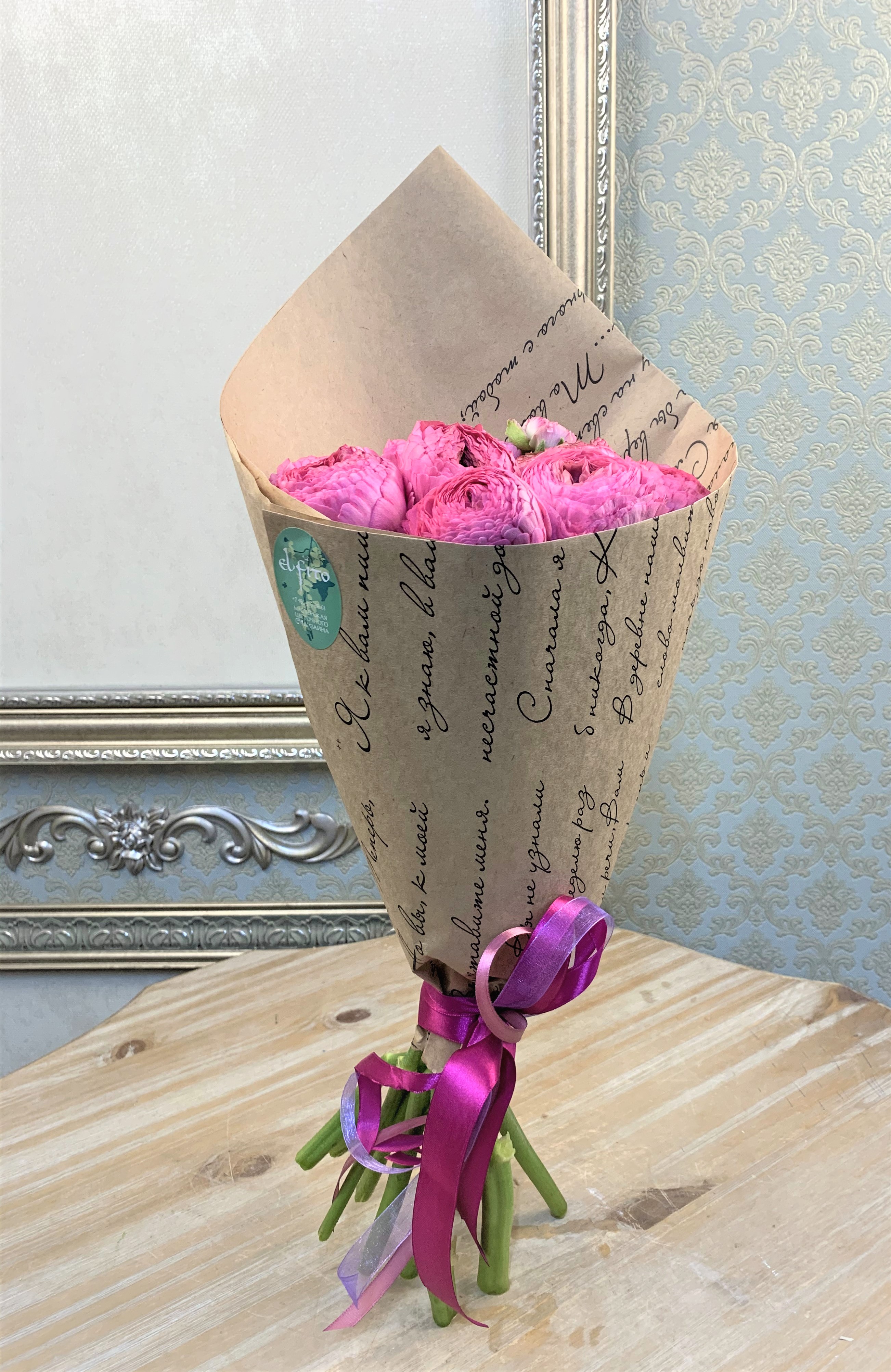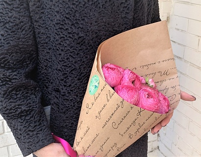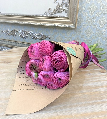 Монобукет из 9 розовых ранункулусов в крафтовой бумаге с атласными лентами и лентами из органзы