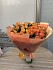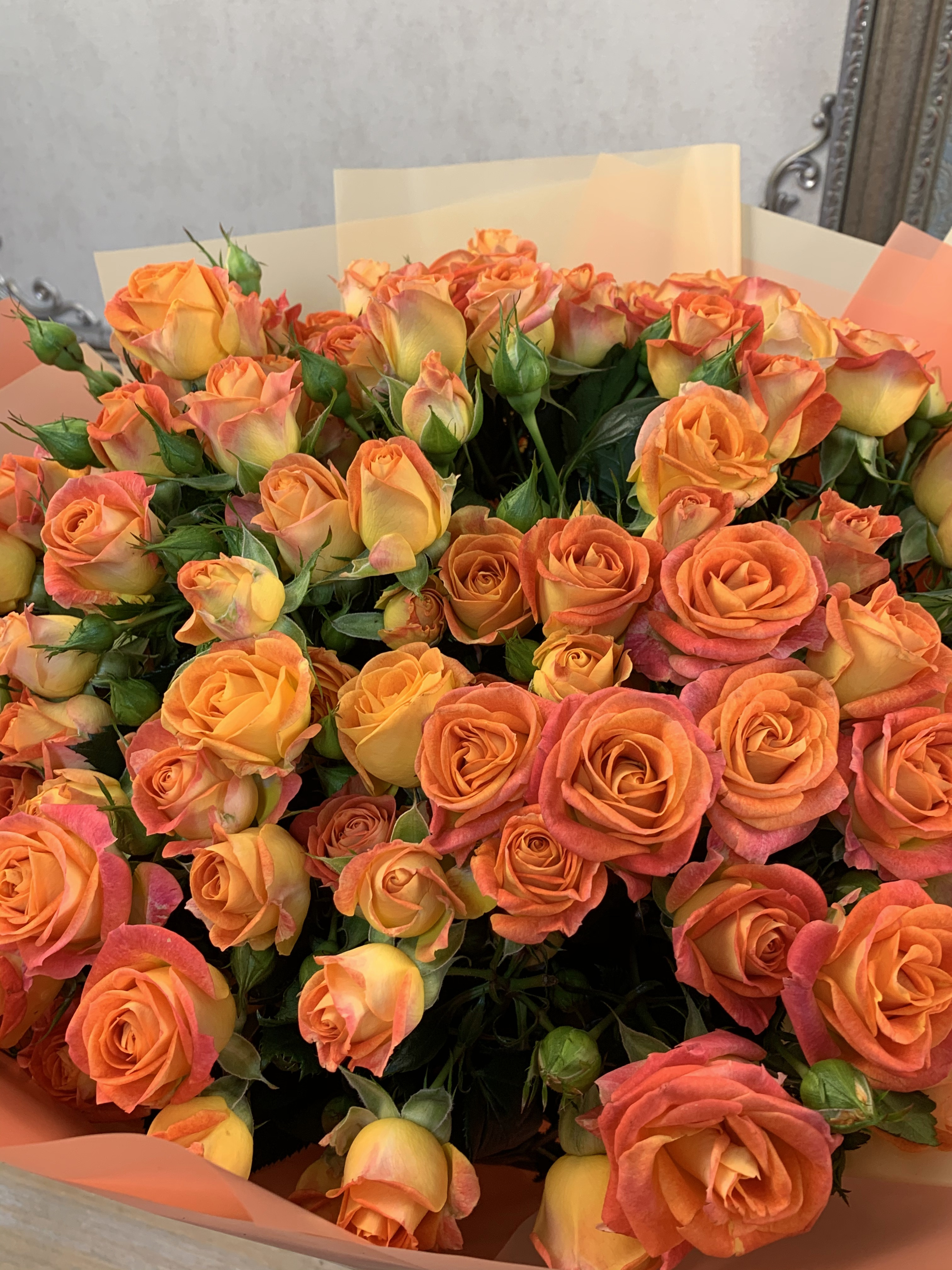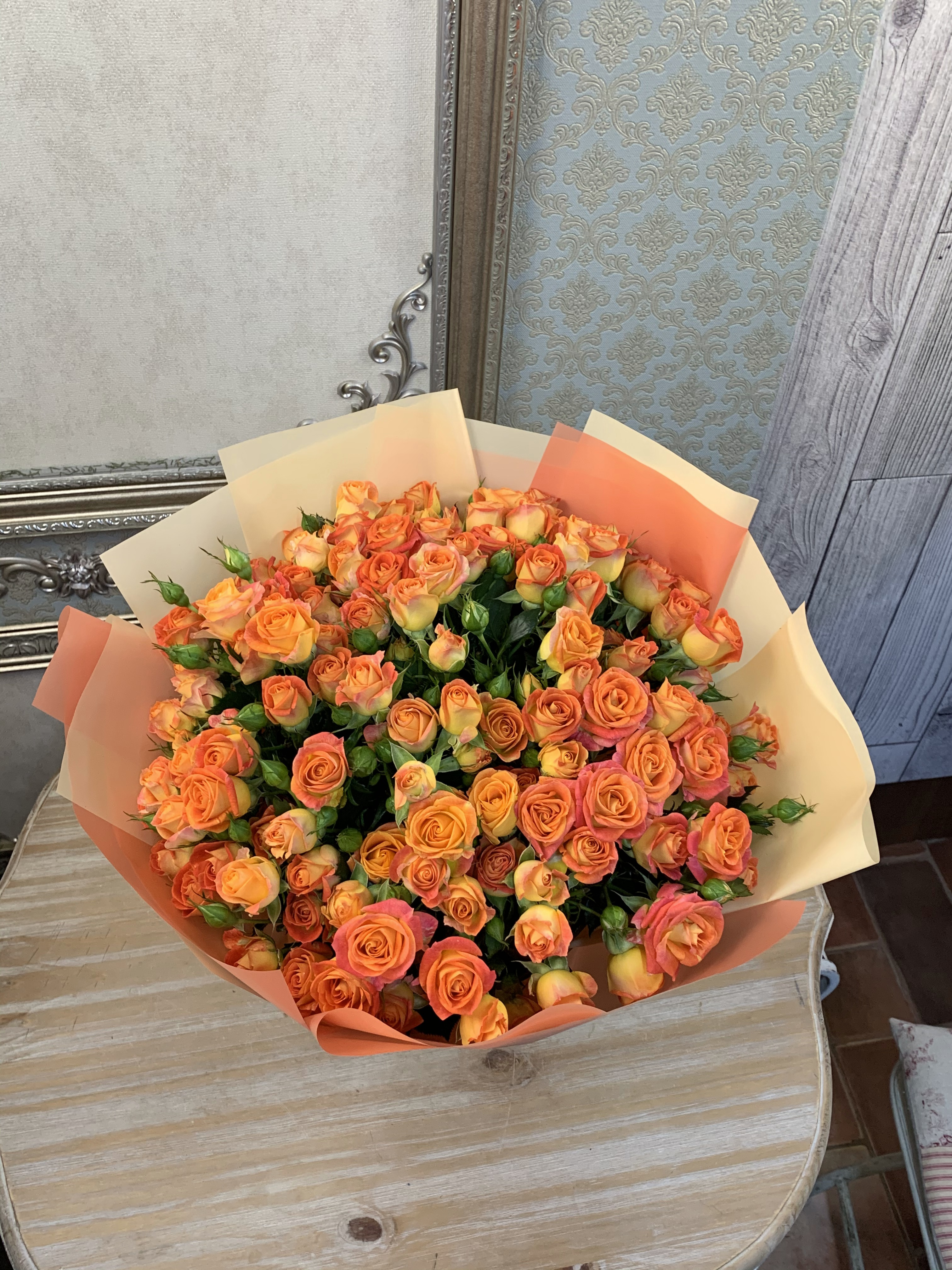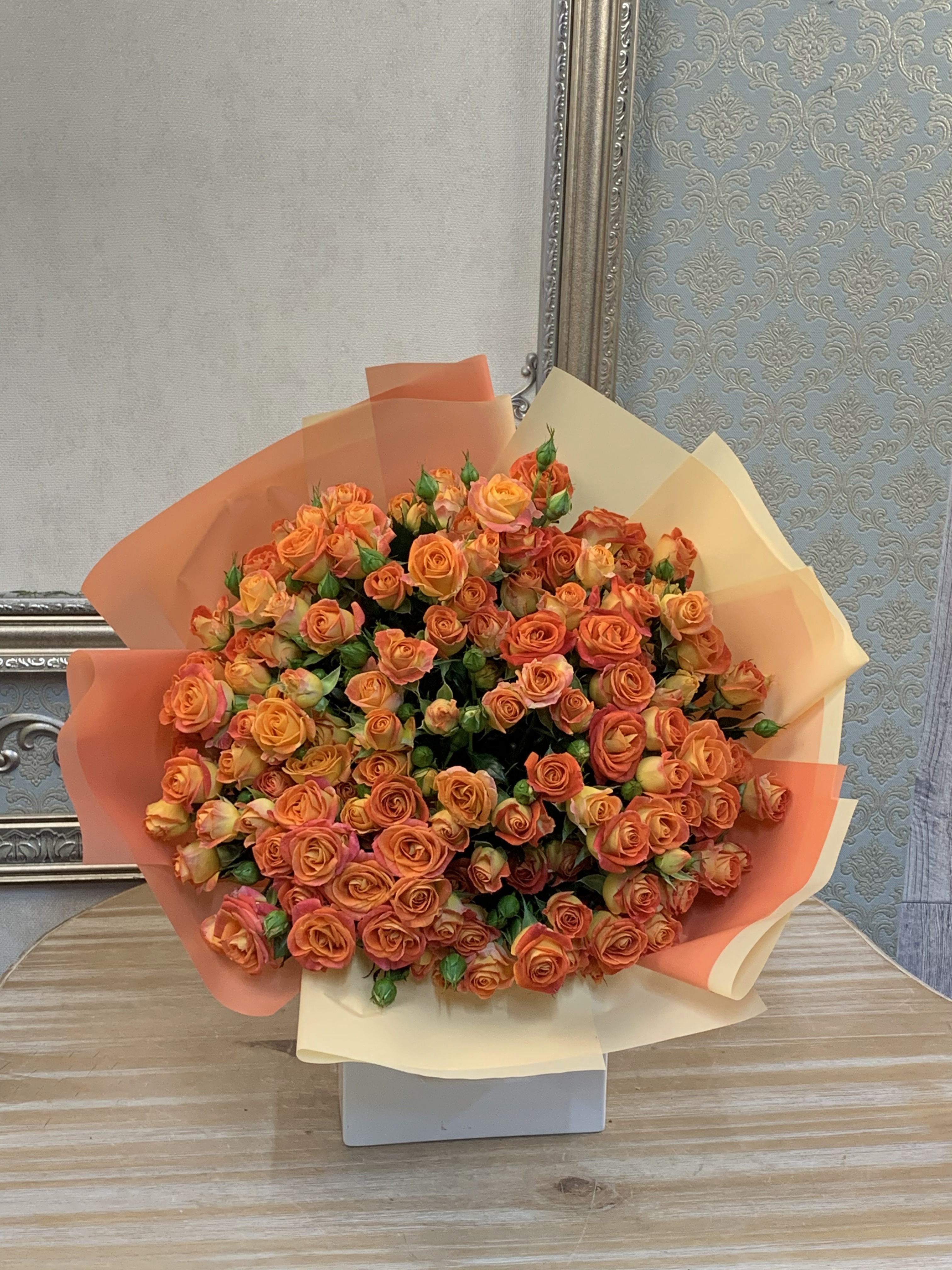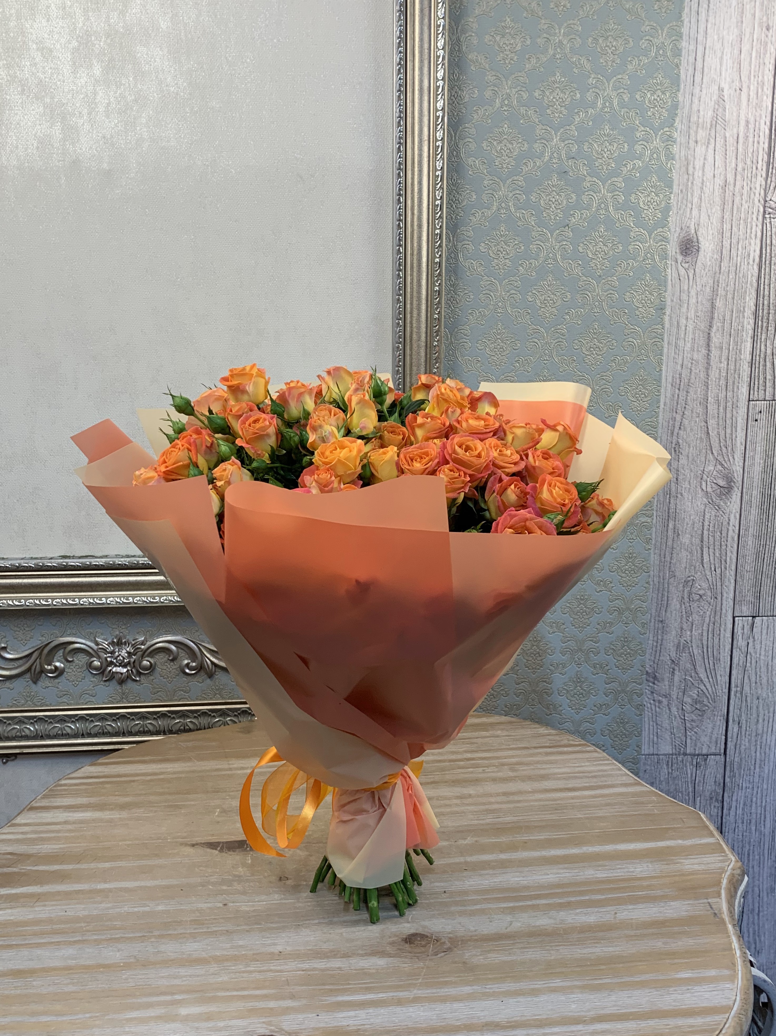 Монобукет из кустовых оранжевых роз (29 шт) в декоративной пленке с атласными лентами и лентами из органзы