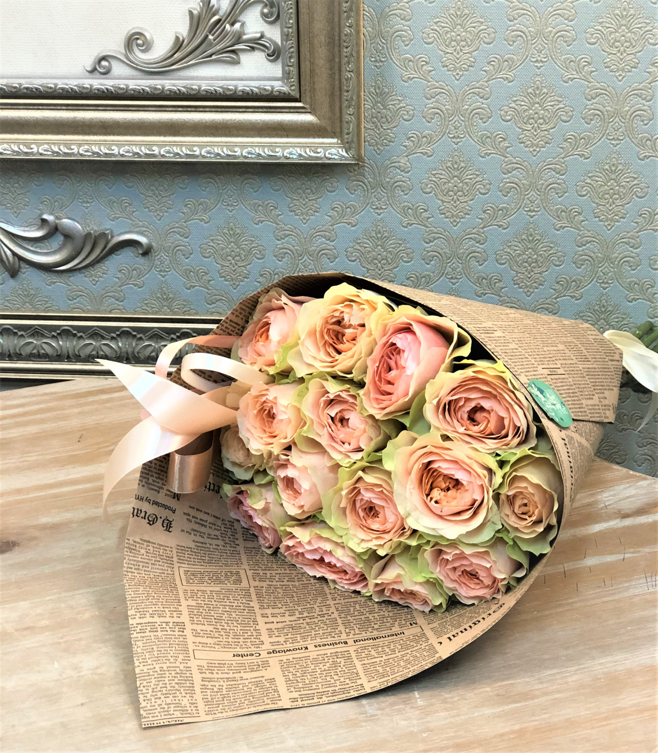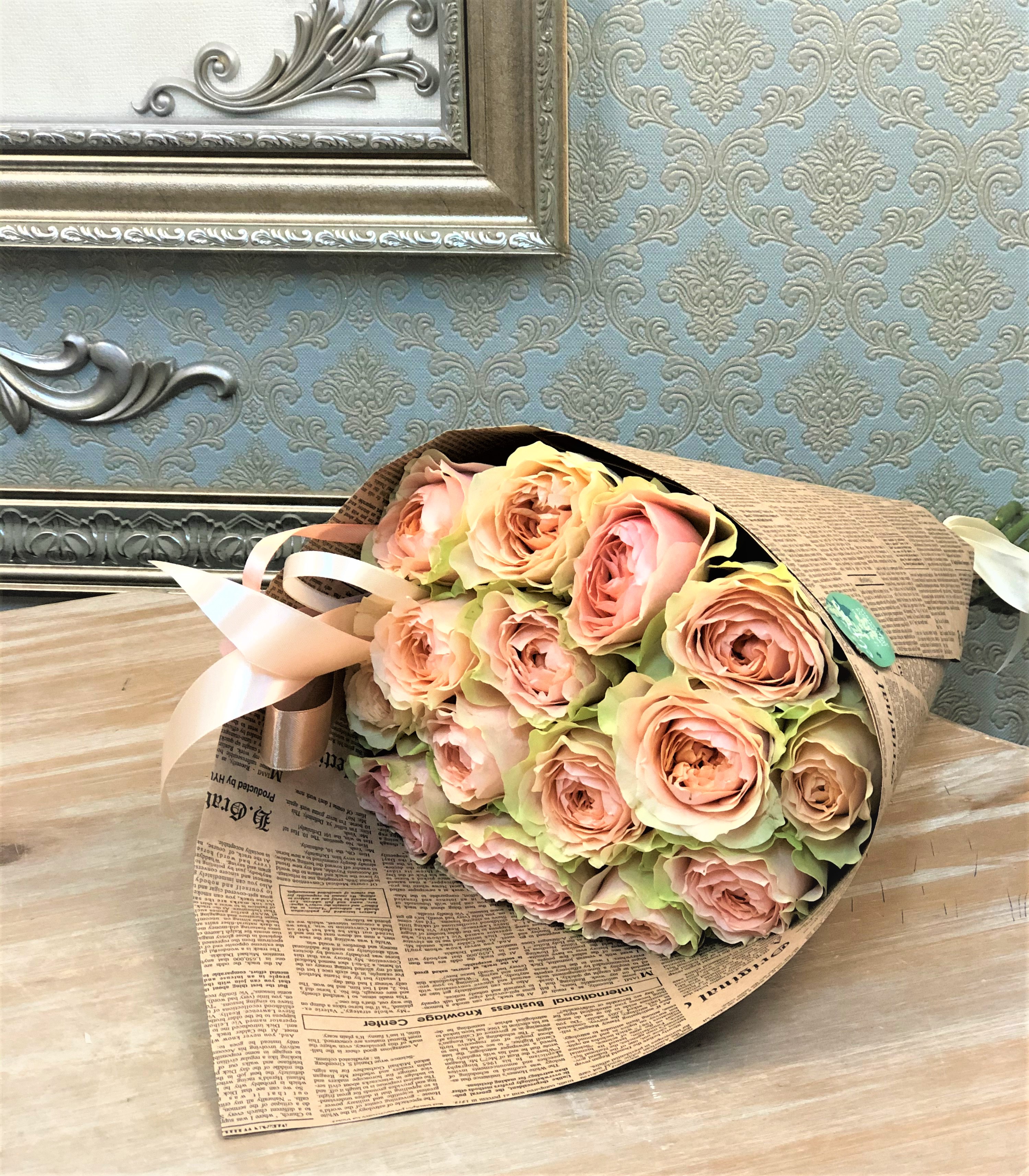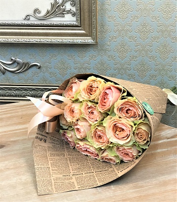 Монобукет с кремовой пионовидной розой (15 шт.) (пр-во Голландия) в крафтовой бумаге с атласными лентами и лентами из органзы