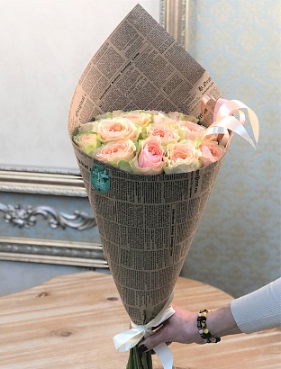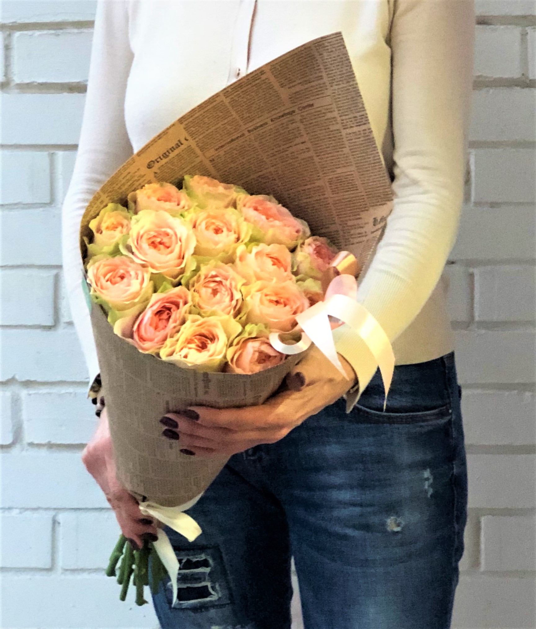 Монобукет с кремовой пионовидной розой (15 шт.) (пр-во Голландия) в крафтовой бумаге...
