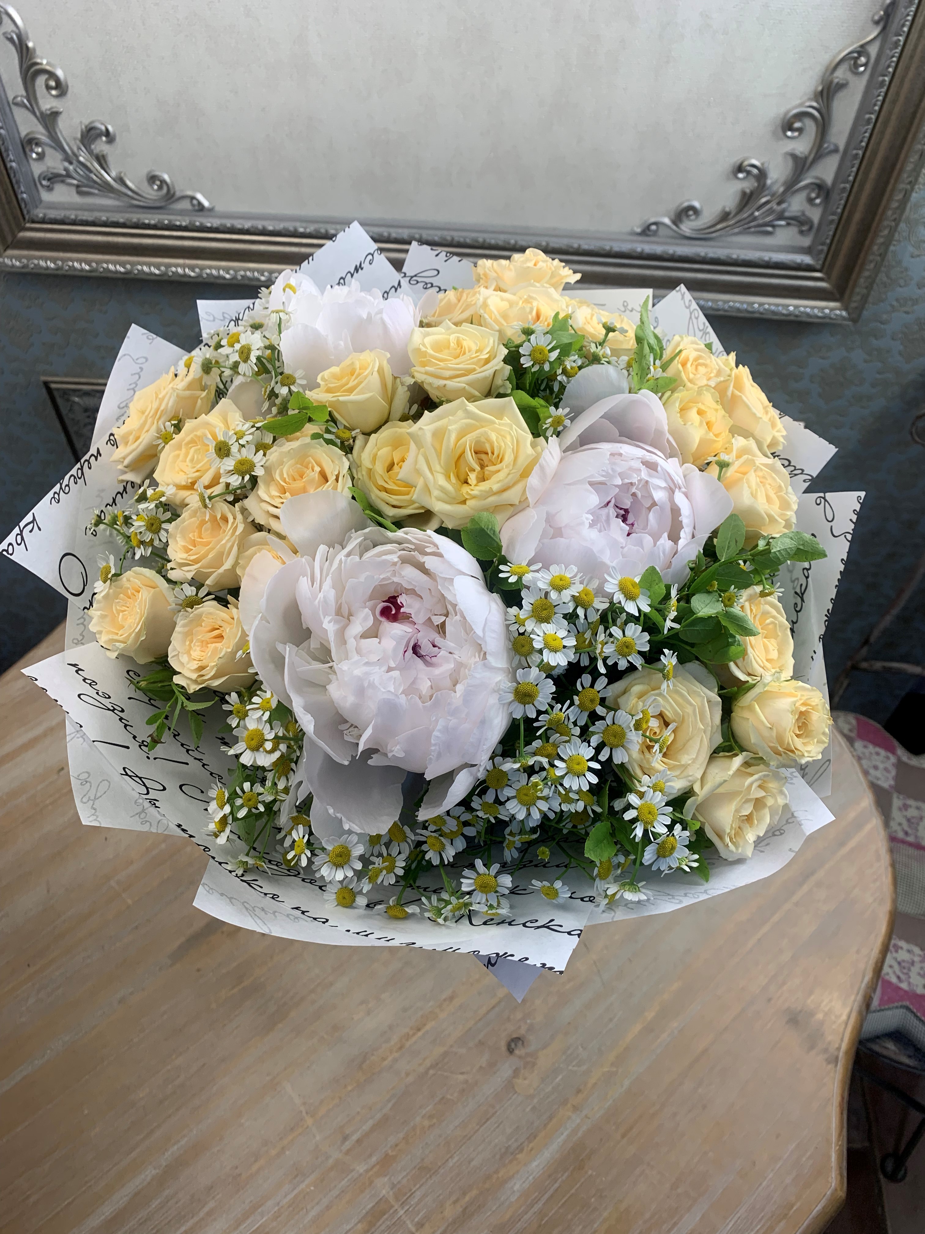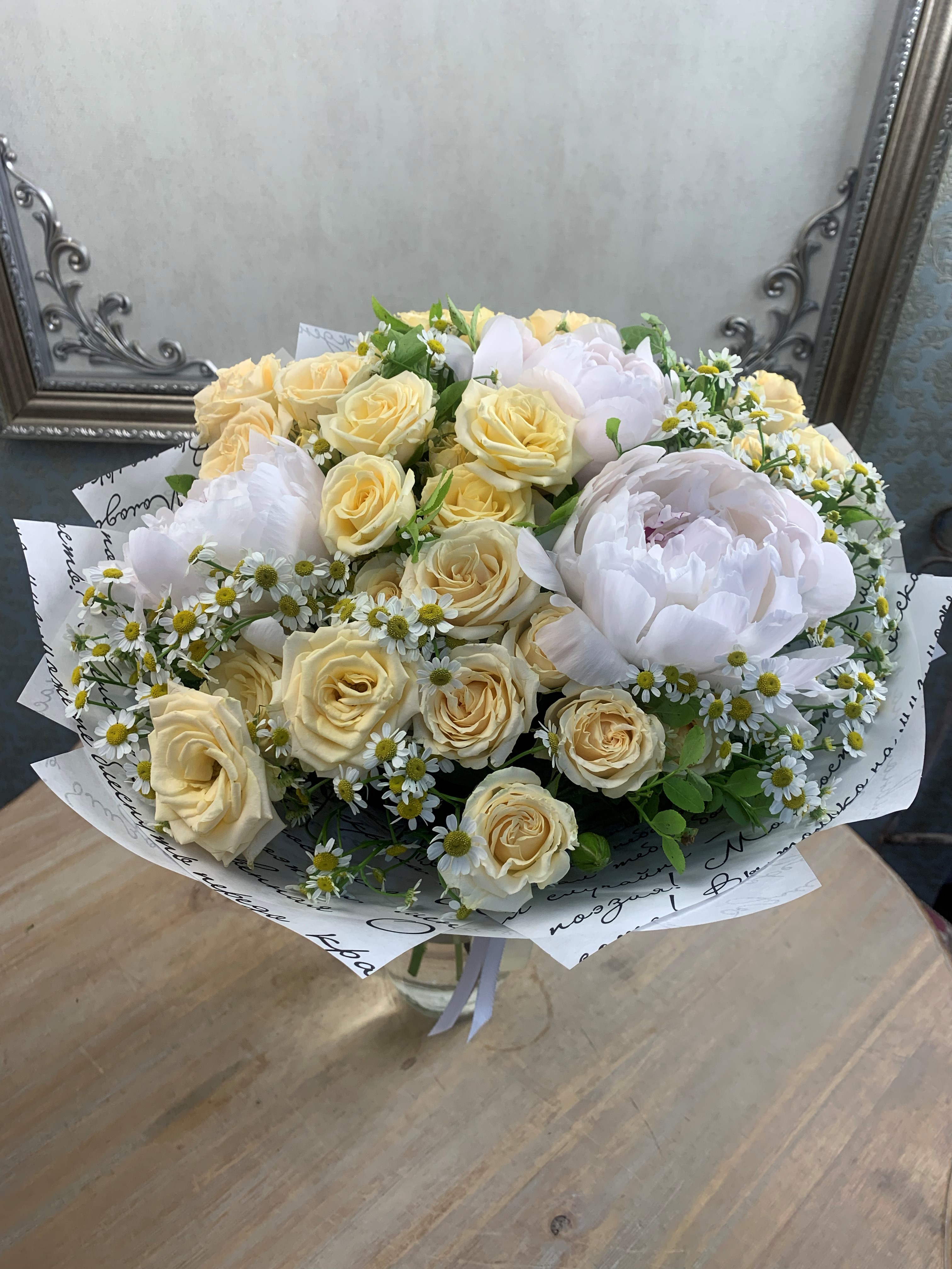 Нежный букет с пионами, розами и матрикарией, создают ощущение ретро-кружева. Подойдут любимой и нежной