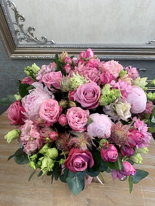 Чудесный букет с пионами, розами, лизиантусом и эвкалиптом. Замечательный подарок как любимой, так и коллеге на день рождения