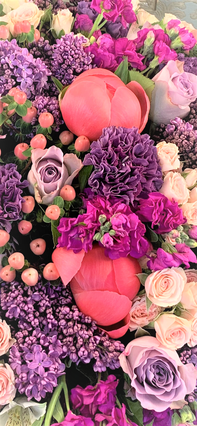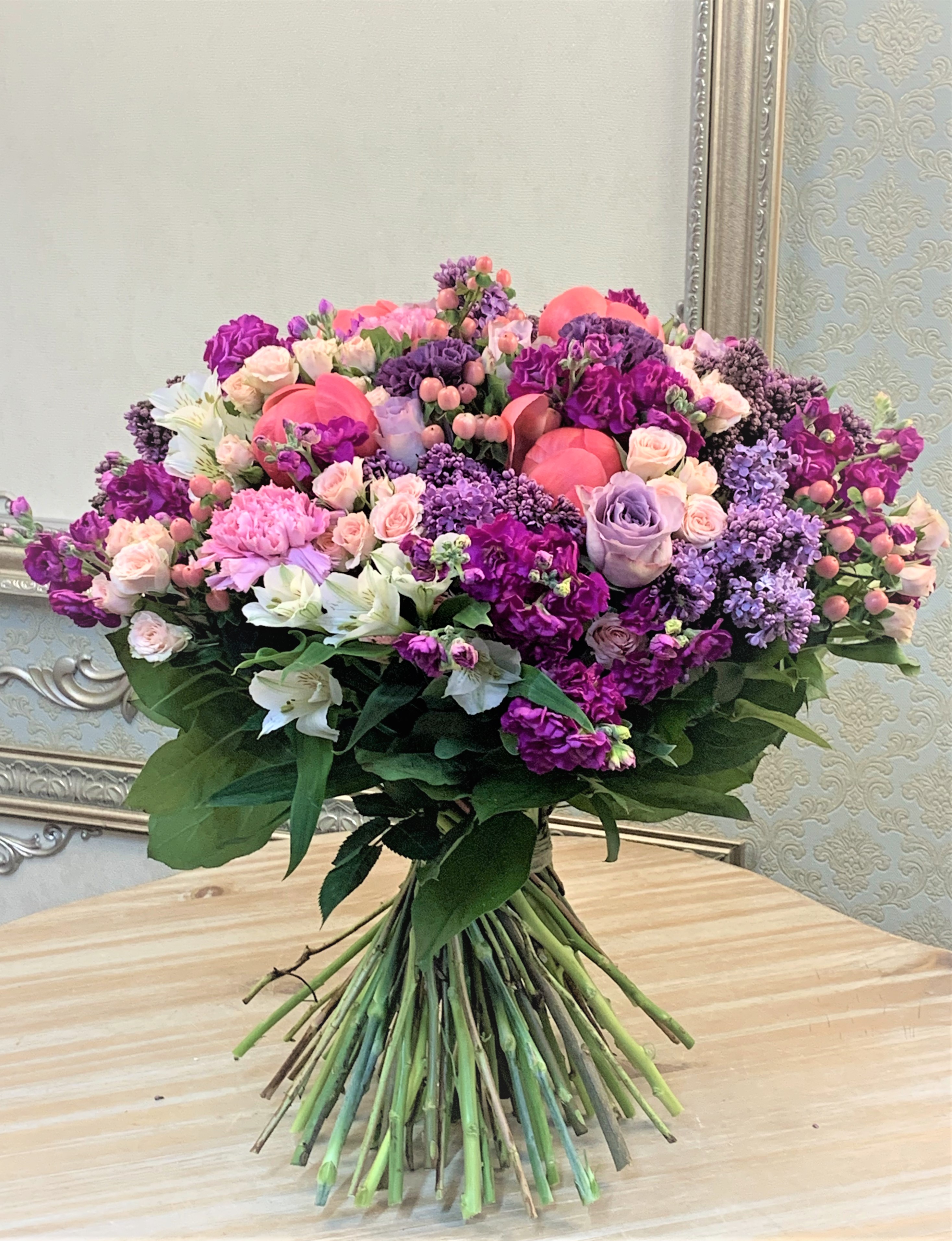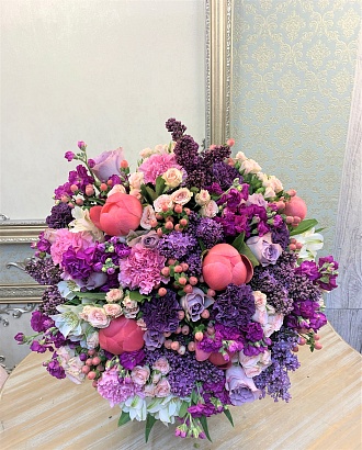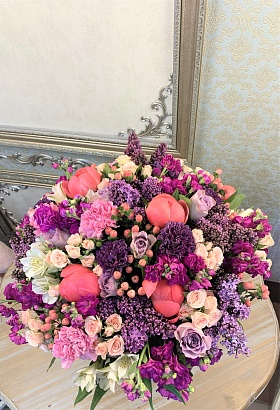 Сборный букет. Состав: Сирень 15, Роза кустовая 10, Роза Морнинг Дью 10, Матиола 8, Гиперикум 10, Гвоздика 10, Пион Корал 5, Альстромерия 5