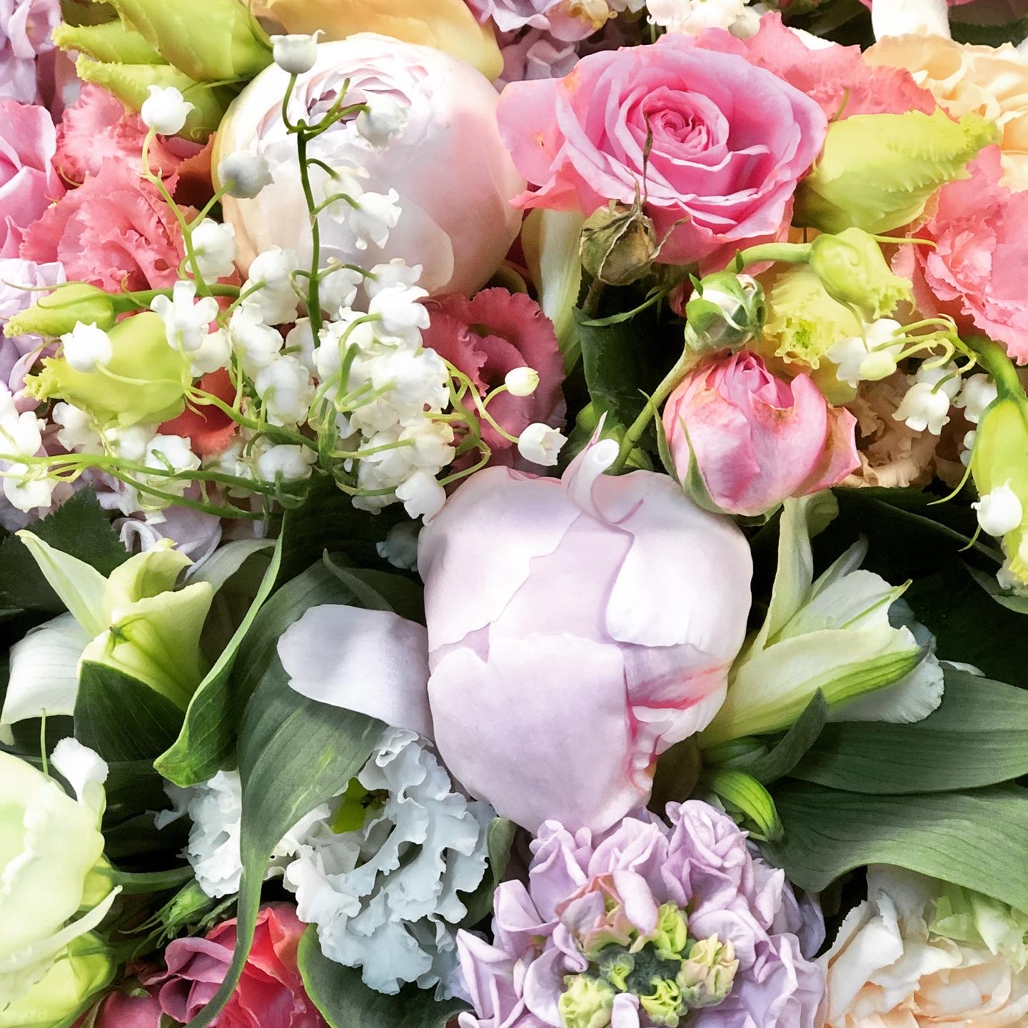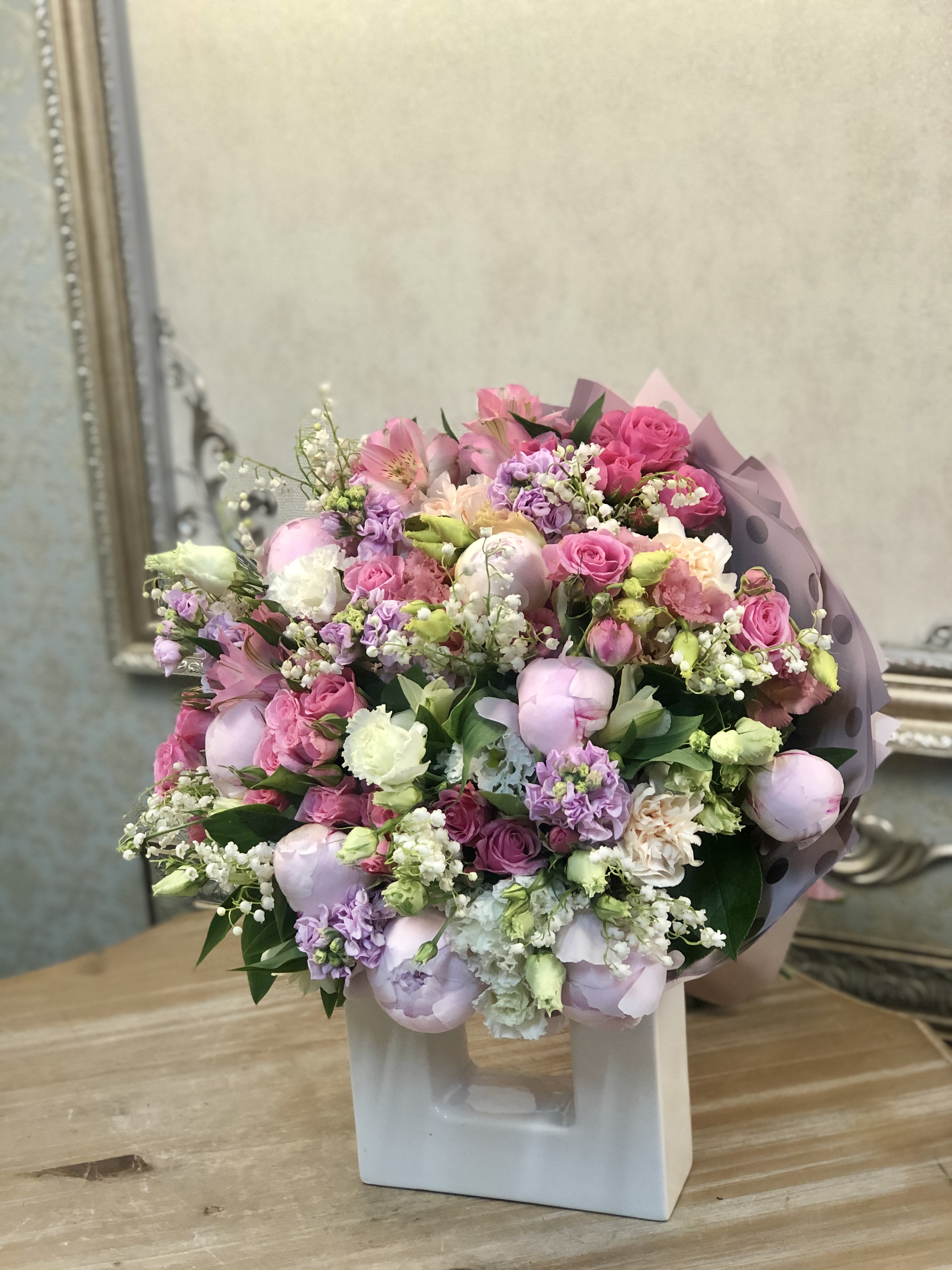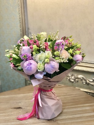 Сборный букет. Состав: Альстромерия 4, Гвоздика 4, Ландыш 2 пуч, Лизиантус 3, Матиола 6, Пион 8, Роза кустовая 7