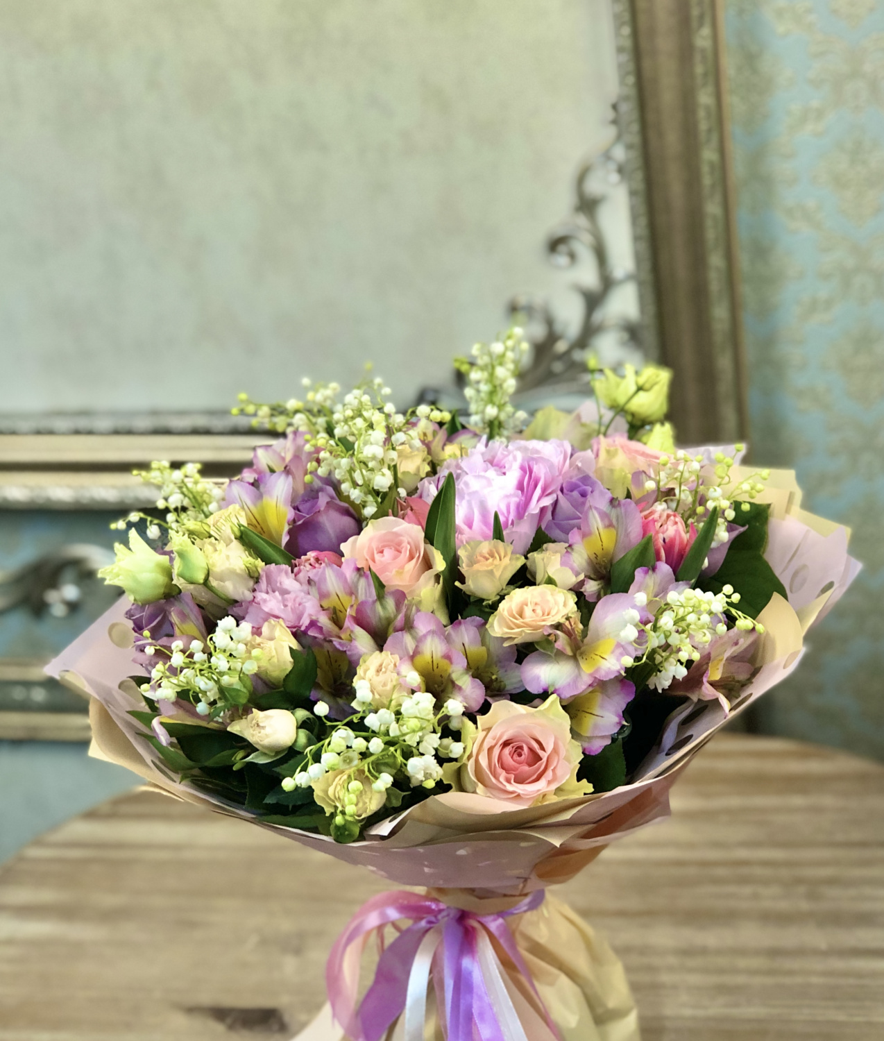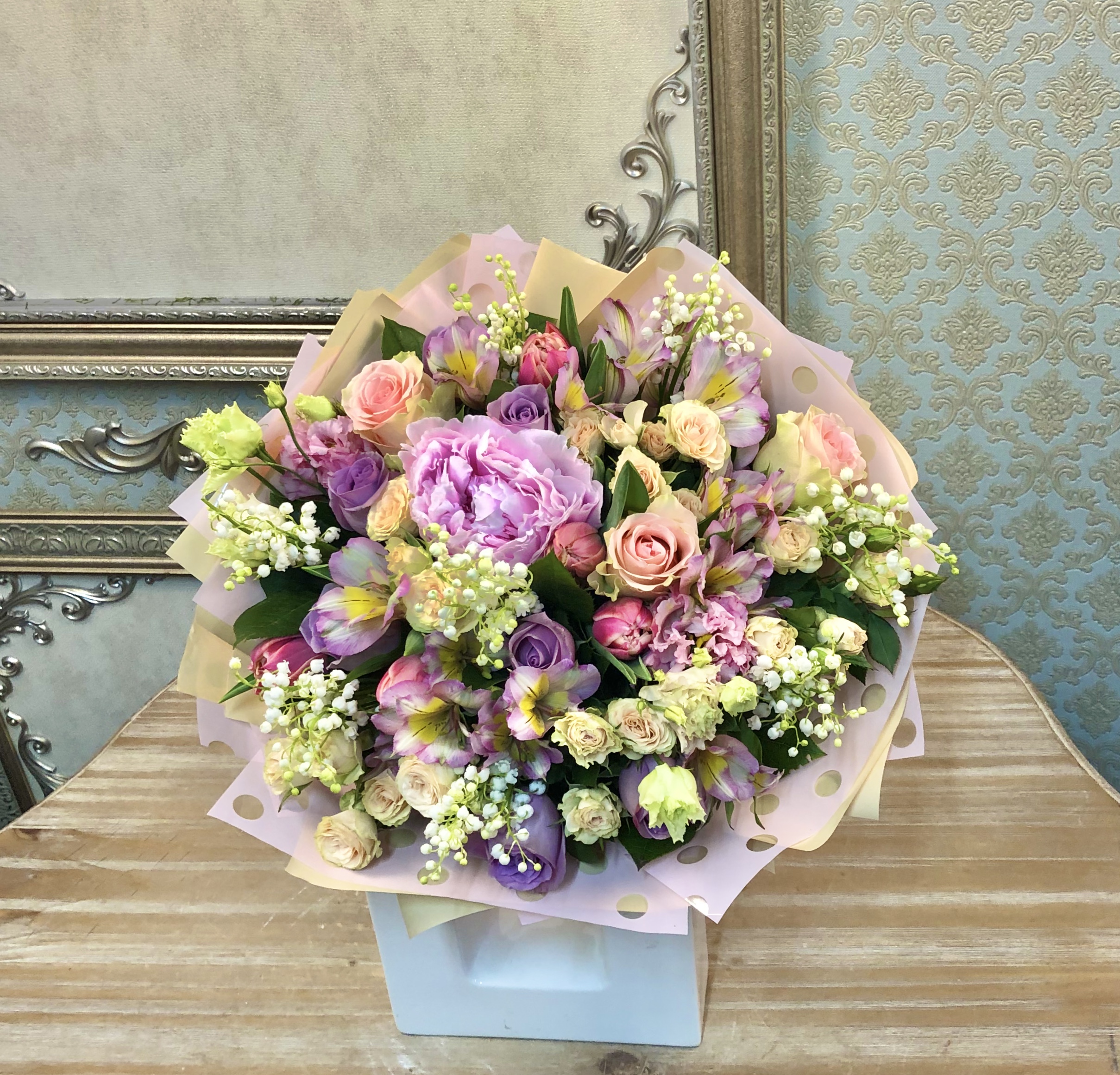 Сборный букет. Состав: Альстромерия 6, Ландыш 1 пуч., Лизиантус 2, Пион 1, Роза 10, Роза кустовая 5, Тюльпан 5