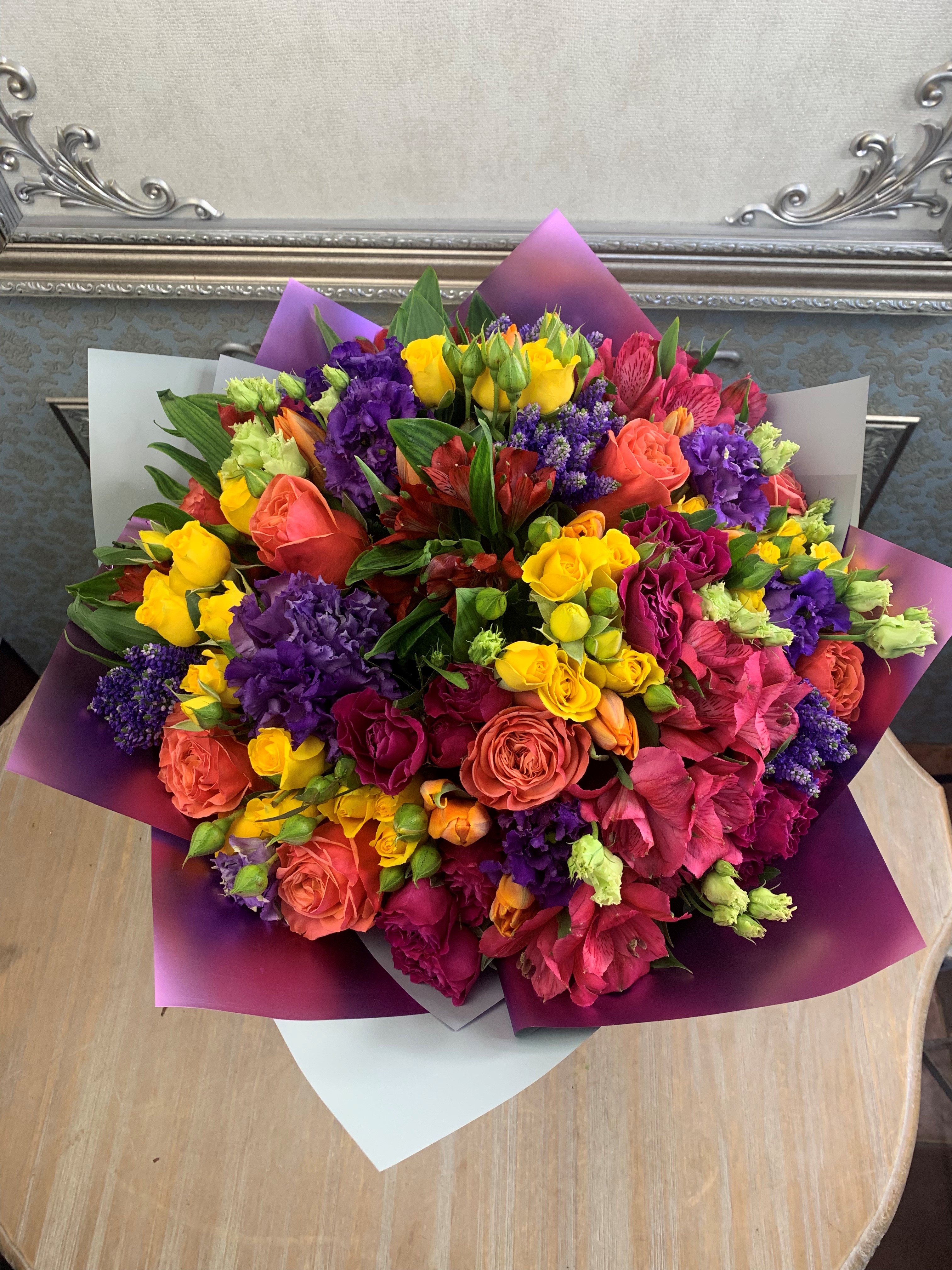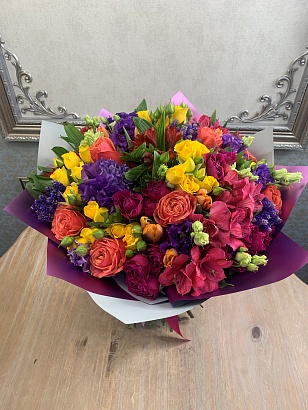Яркий букет в дизайнерской пленке с атласной лентой для яркой женщины