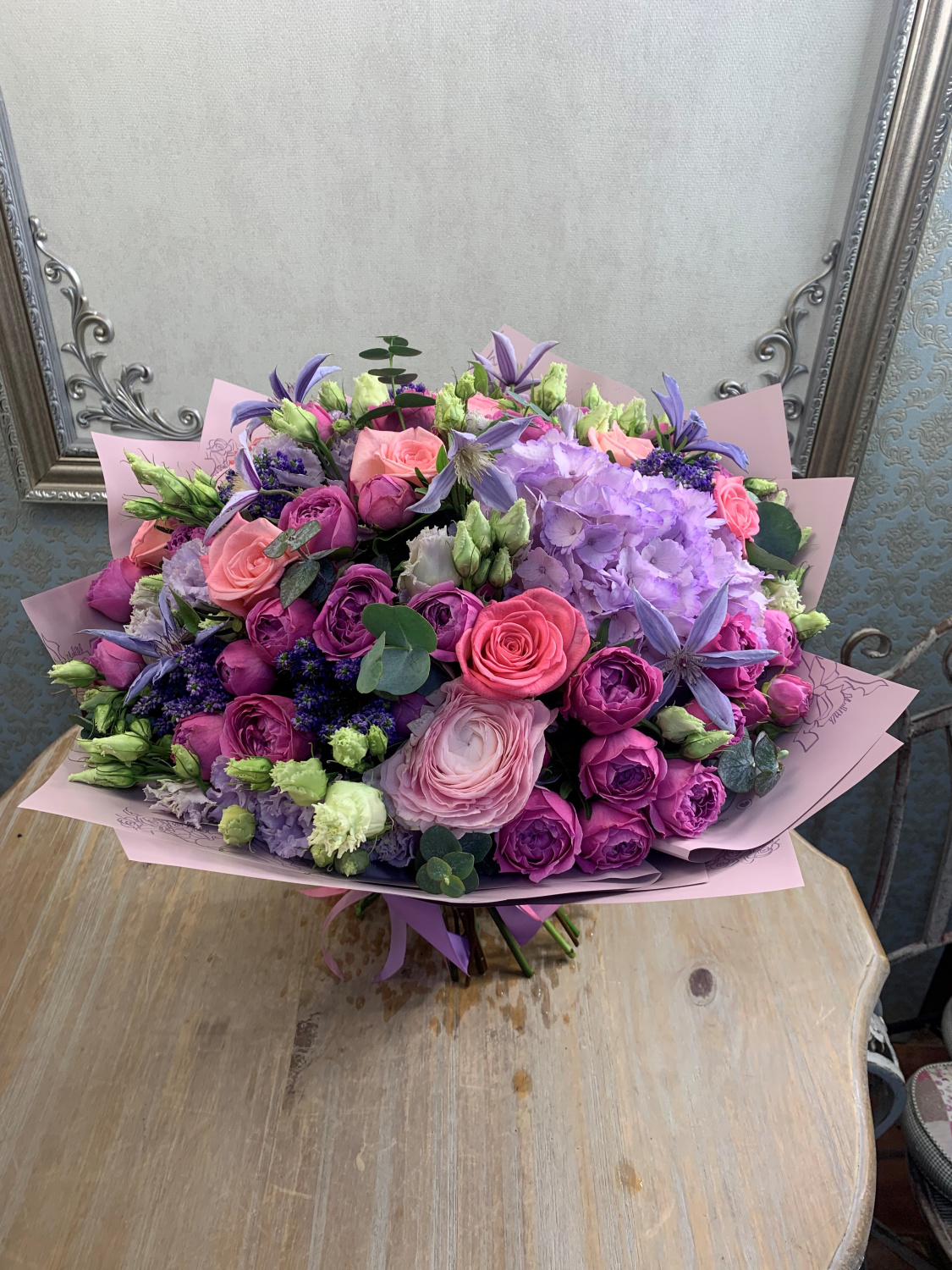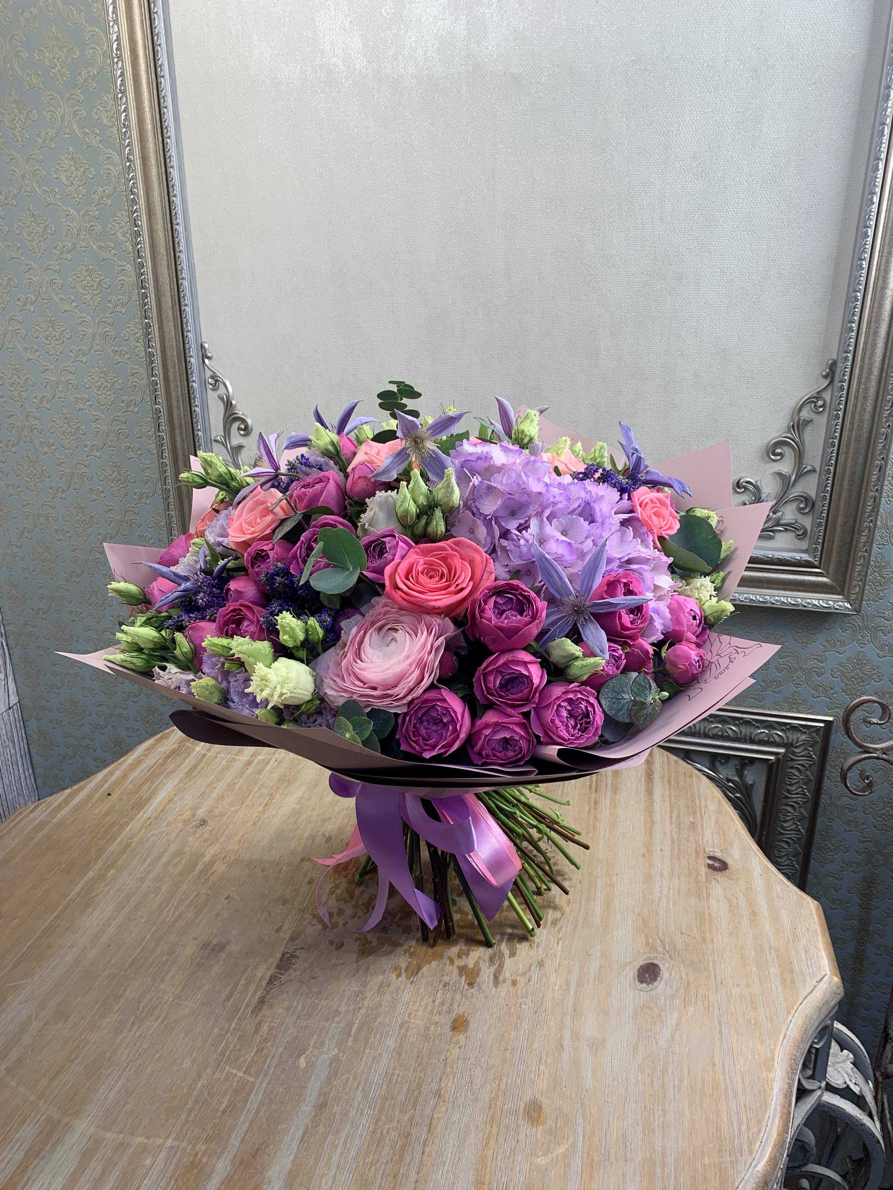 с розами/с вероникой/с гортензией/с клематисом/с питоспорумом/с ранункулусом/с розой кустовой пионовидной/с эвкалиптом/с лизиантусами