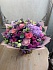 Букет с фиолетовой гортензией, дизайнерской пленкой и атласными лентами