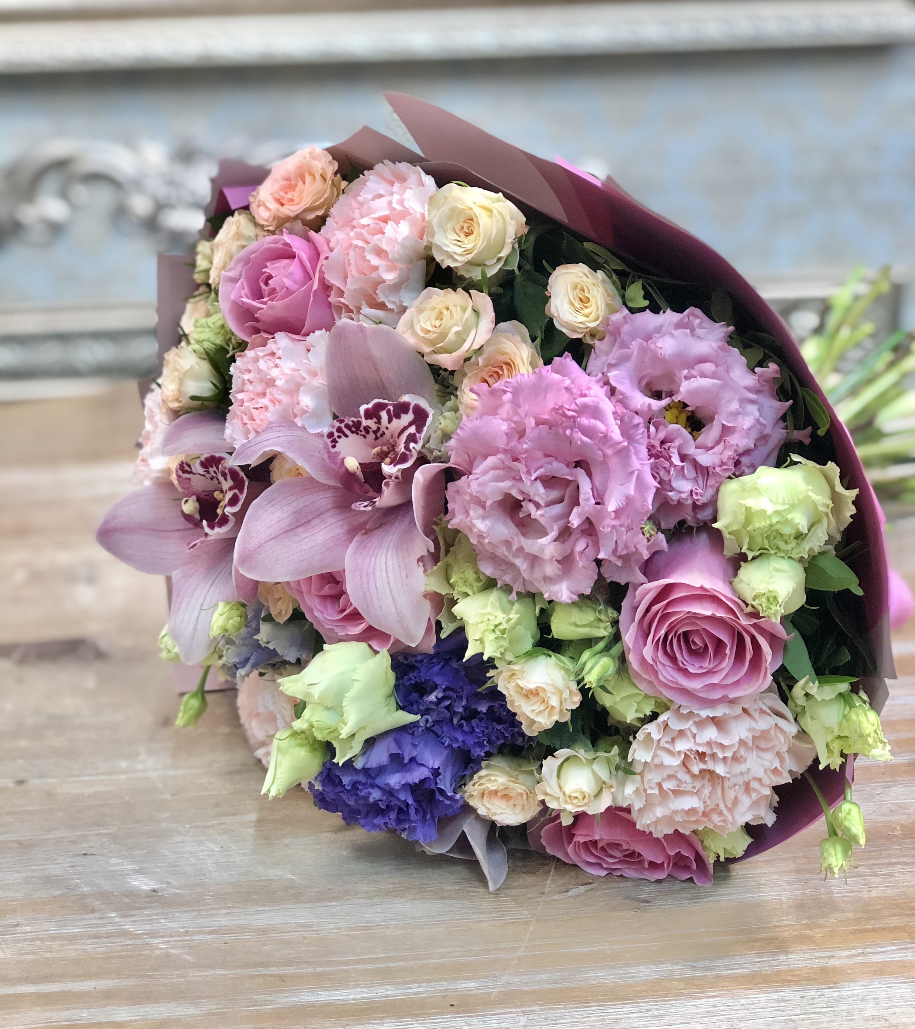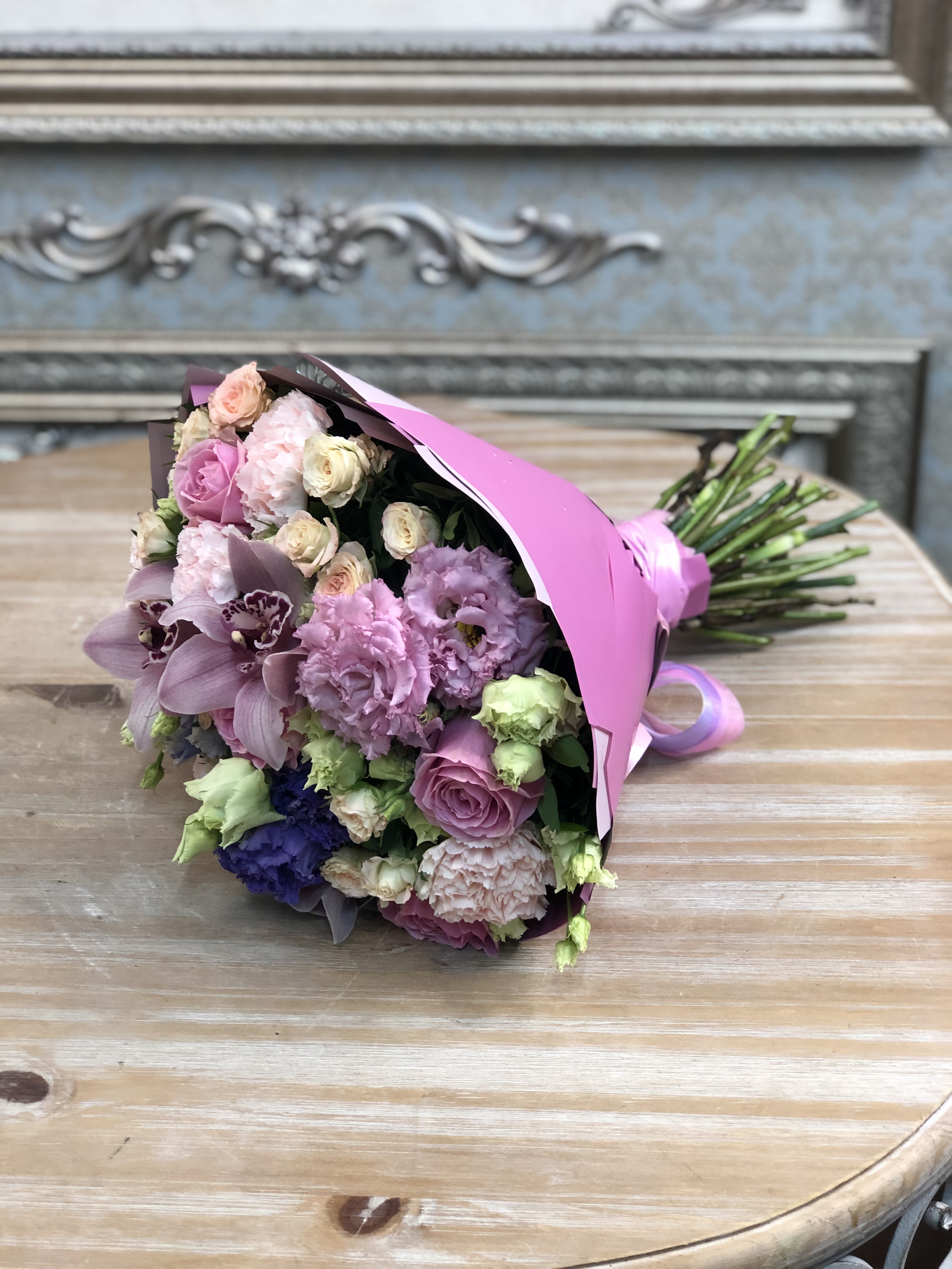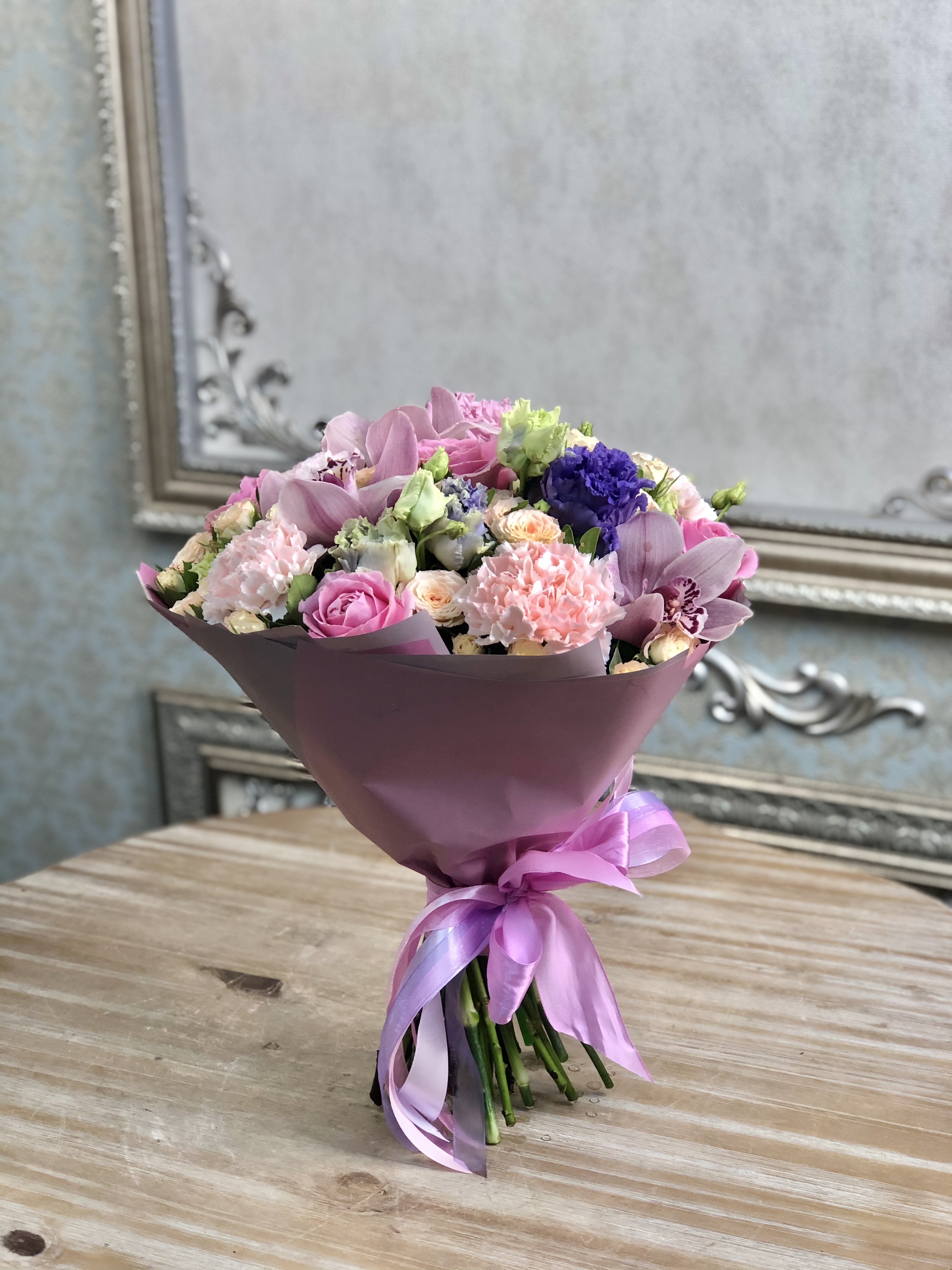 Сборный букет. Состав: Гвоздика 4, Лизиантус 3, Роза 5, Розв кустовая 5, Орхидея цимбидиум 3 Упаковк...