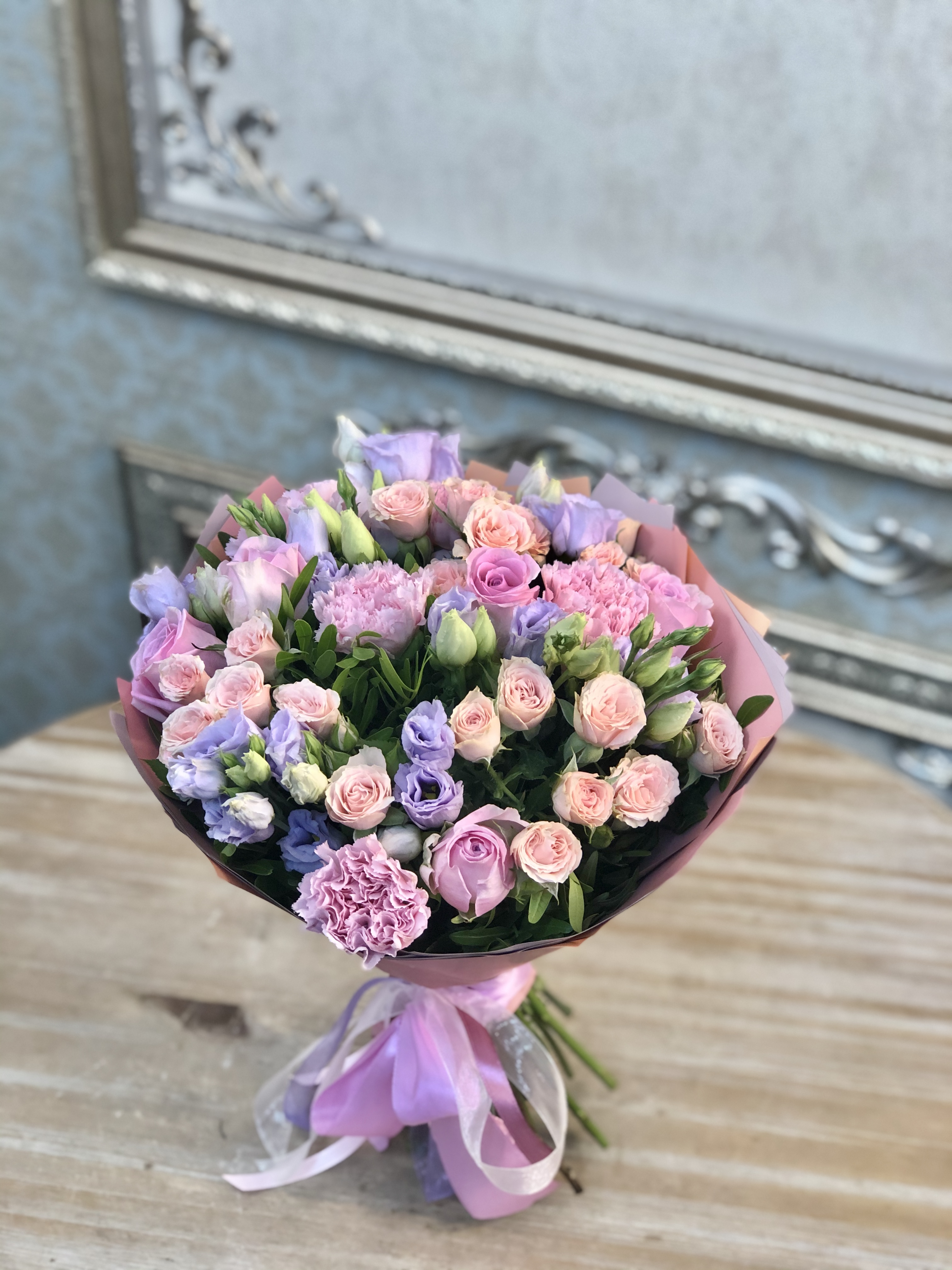 Сборный букет. Состав: Гвоздика 5, Лизиантус 4, Роза 5, Роза кустовая 4