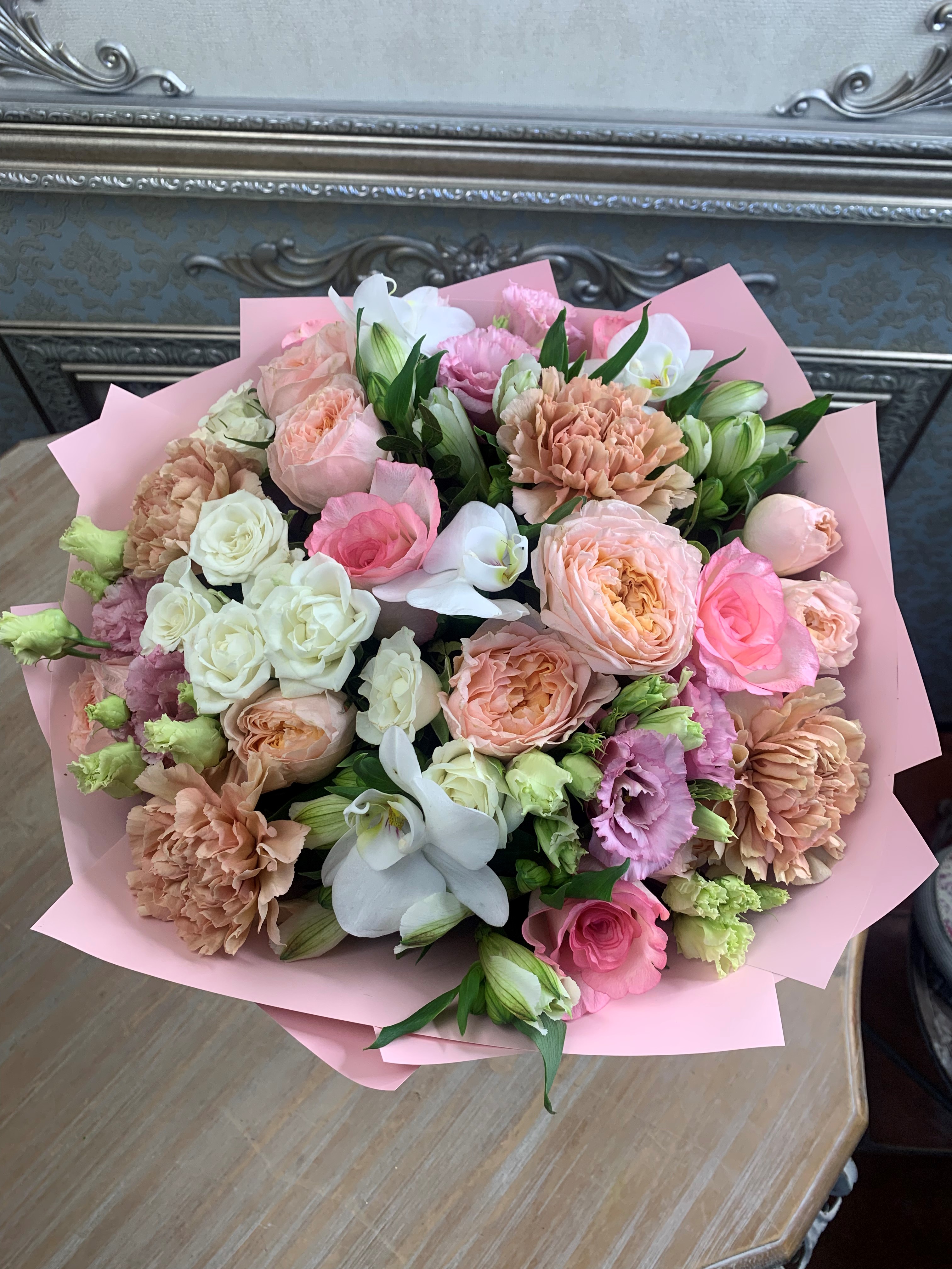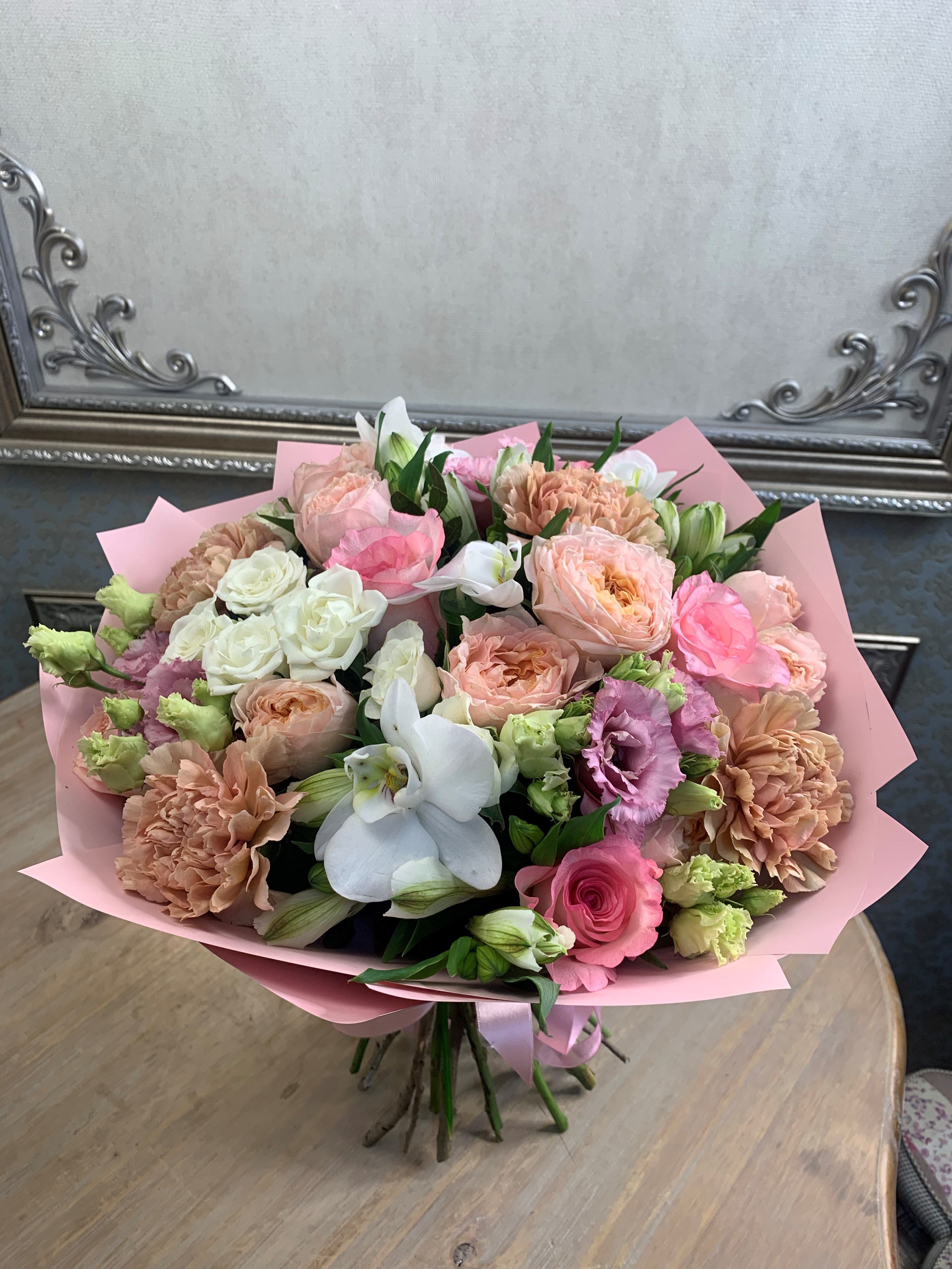 Нежно-розовый букет с роскошными розами орхидеями и лизиантусом станет приятным подарком для любимой