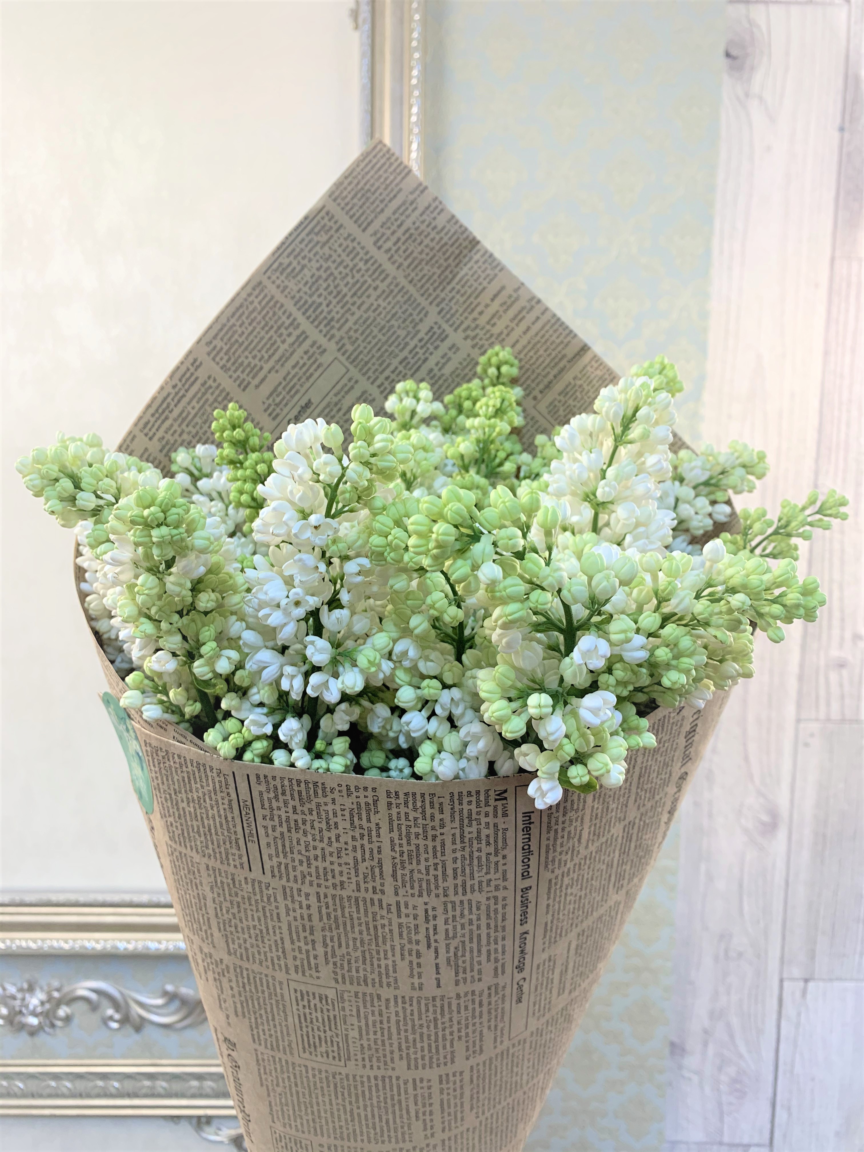 Монобукет из белой сирени (пр-во Голландия) 9 веток в крафтовой бумаге с атласными лентами и...