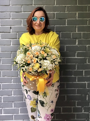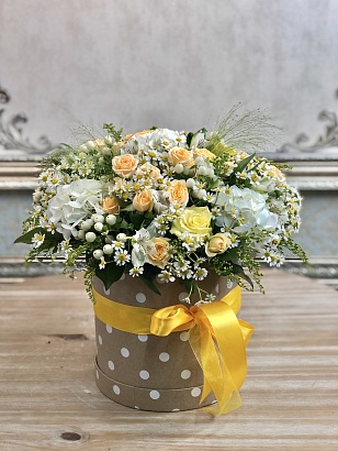 Цветочная композиция в шляпной коробке в горошек с альстромерией, гиперикумом, матрикарией, паникумом, розой, кустовой розой, солидаго, писташью с атласными лентами и лентами из органзы