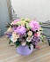 Цветочная композиция в лавандовой шляпной коробке с лизиантусом (эустомой), розами, кустовыми розами, сиренью, папоротником, атласными лентами и лентами из органзы