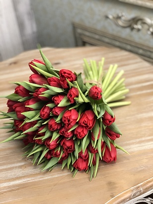 Монобукет тюльпанов Рэд Принцесс (49 штук) с атласной лентой и лентой из органзы